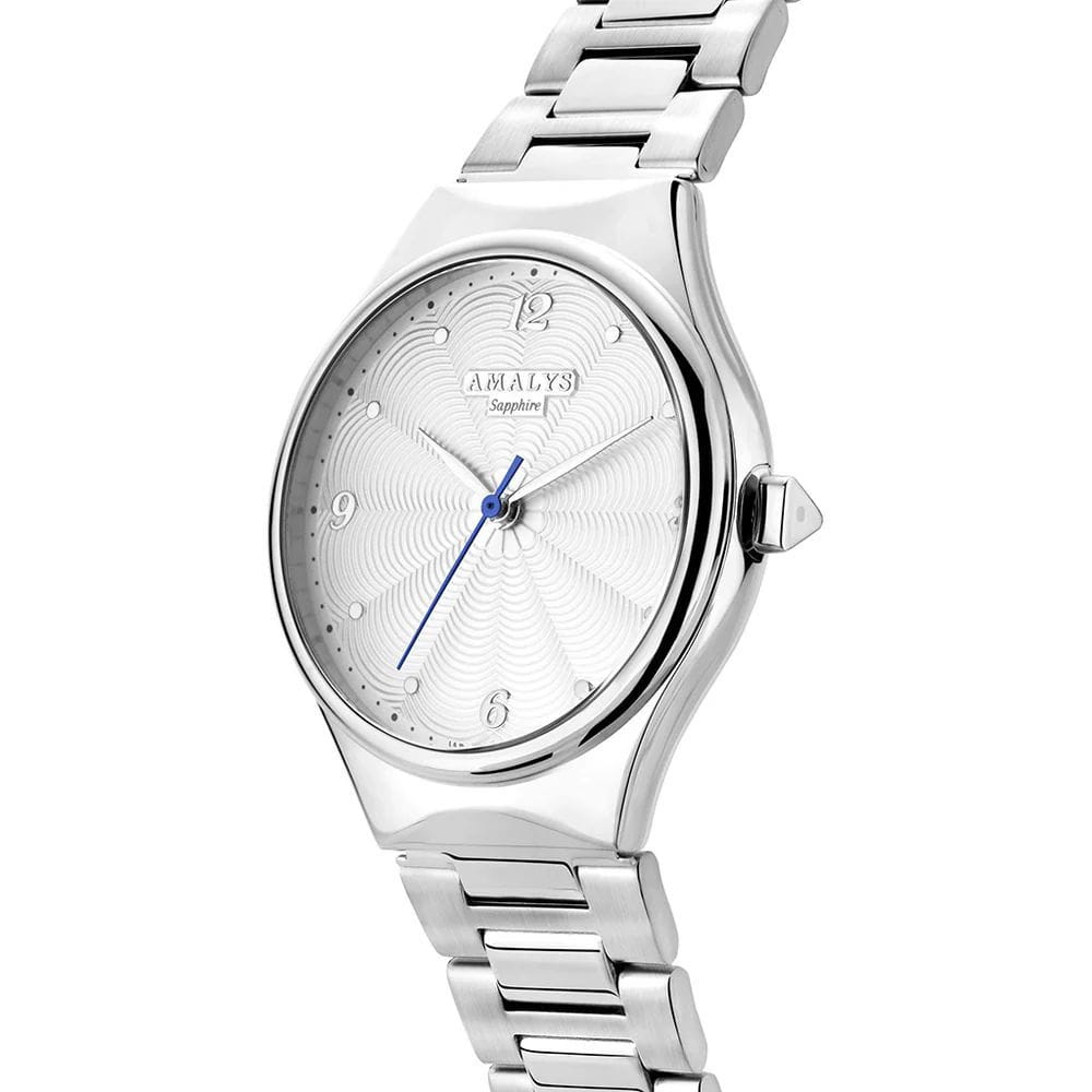 Amalys AMW-156 — женская модель с утончённым современным дизайном, в которой сочетаются минимализм и элегантность. Круглый корпус диаметром 31 мм в серебристом цвете гармонирует с браслетом шириной 16 мм, выполненным из нержавеющей стали и оснащённым раскладным замкомРаскладной замокДанный вариант застежки используется только на часах с металлическим браслетом. Отличительная особенность такого крепления в том, что длина браслета становится универсальной и вы можете самостоятельно отрегулировать нужный вам размер – застежка просто двигается по браслету часов., обеспечивающим удобство и надёжность при носке. Механизм — кварцевый, что гарантирует точный и стабильный ход. Защитную функцию выполняет сапфировое стеклоСапфировое стеклоПрочный и надёжный материал из кристалла сапфира синтетического происхождения, характеризующийся особой твёрдостью и устойчивостью к царапинам и повреждениям., стойкое к царапинам и сохраняющее прозрачность. Водозащита 5 ATM делает модель устойчивой к случайным брызгам и кратковременному контакту с водой. Лаконичный циферблат с декоративным узором и изящными стрелками подчёркивает изысканный характер часов, создавая универсальный образ, подходящий как для повседневных ситуаций, так и для особых случаев.