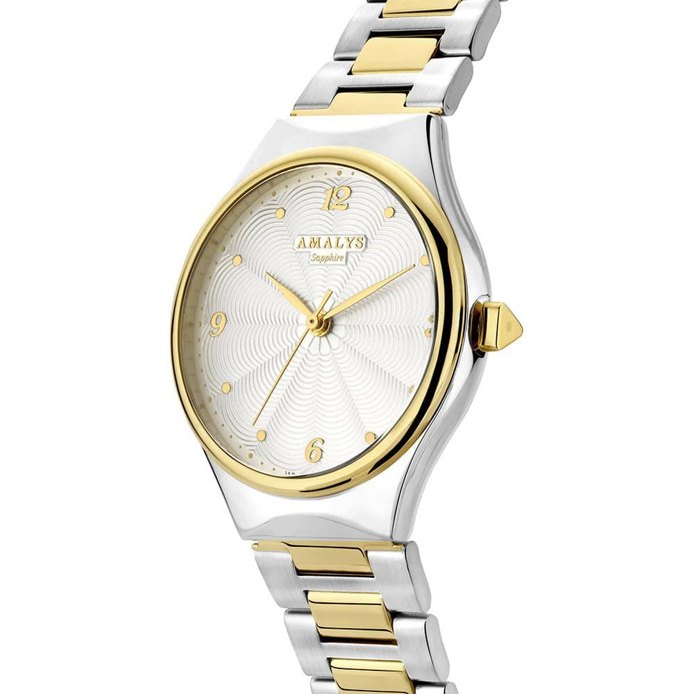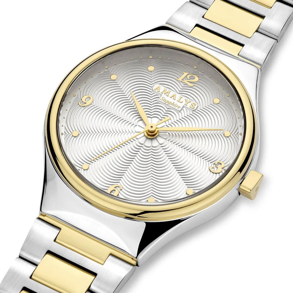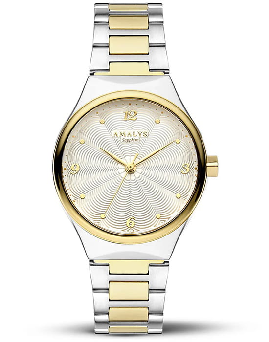 Amalys AMW-157 — женская модель с утончённым современным дизайном, в которой сочетаются минимализм и элегантность. Круглый корпус диаметром 31 мм гармонирует с браслетом с PVD-покрытиемPVDУльтратонкое покрытие наносится в технике вакуумного напыления, сочетает в себе нитрид титана особой прочности со слоем золота или оксида хрома. Несёт в себе декоративную или защитную функцию. шириной 16 мм, выполненным из нержавеющей стали и оснащённым раскладным замкомРаскладной замокДанный вариант застежки используется только на часах с металлическим браслетом. Отличительная особенность такого крепления в том, что длина браслета становится универсальной и вы можете самостоятельно отрегулировать нужный вам размер – застежка просто двигается по браслету часов., обеспечивающим удобство и надёжность при носке. БезельБезельВнешний ободок, закрепляющий стекло. В спортивных часах так называется поворотное кольцо с делениями на циферблате, выполняет роль таймера – замеряет отрезки времени на шкале. Неподвижный безель – элемент декора. Однонаправленно вращающийся безель на дайверских часах позволяет фиксировать моменты погружения и выныривания на поверхность. с PVD-покрытиемPVDУльтратонкое покрытие наносится в технике вакуумного напыления, сочетает в себе нитрид титана особой прочности со слоем золота или оксида хрома. Несёт в себе декоративную или защитную функцию.. Механизм — кварцевый, что гарантирует точный и стабильный ход. Защитную функцию выполняет сапфировое стеклоСапфировое стеклоПрочный и надёжный материал из кристалла сапфира синтетического происхождения, характеризующийся особой твёрдостью и устойчивостью к царапинам и повреждениям., стойкое к царапинам и сохраняющее прозрачность. Водозащита 5 ATM делает модель устойчивой к случайным брызгам и кратковременному контакту с водой. Лаконичный циферблат с декоративным узором и изящными стрелками подчёркивает изысканный характер часов, создавая универсальный образ, подходящий как для повседневных ситуаций, так и для особых случаев.