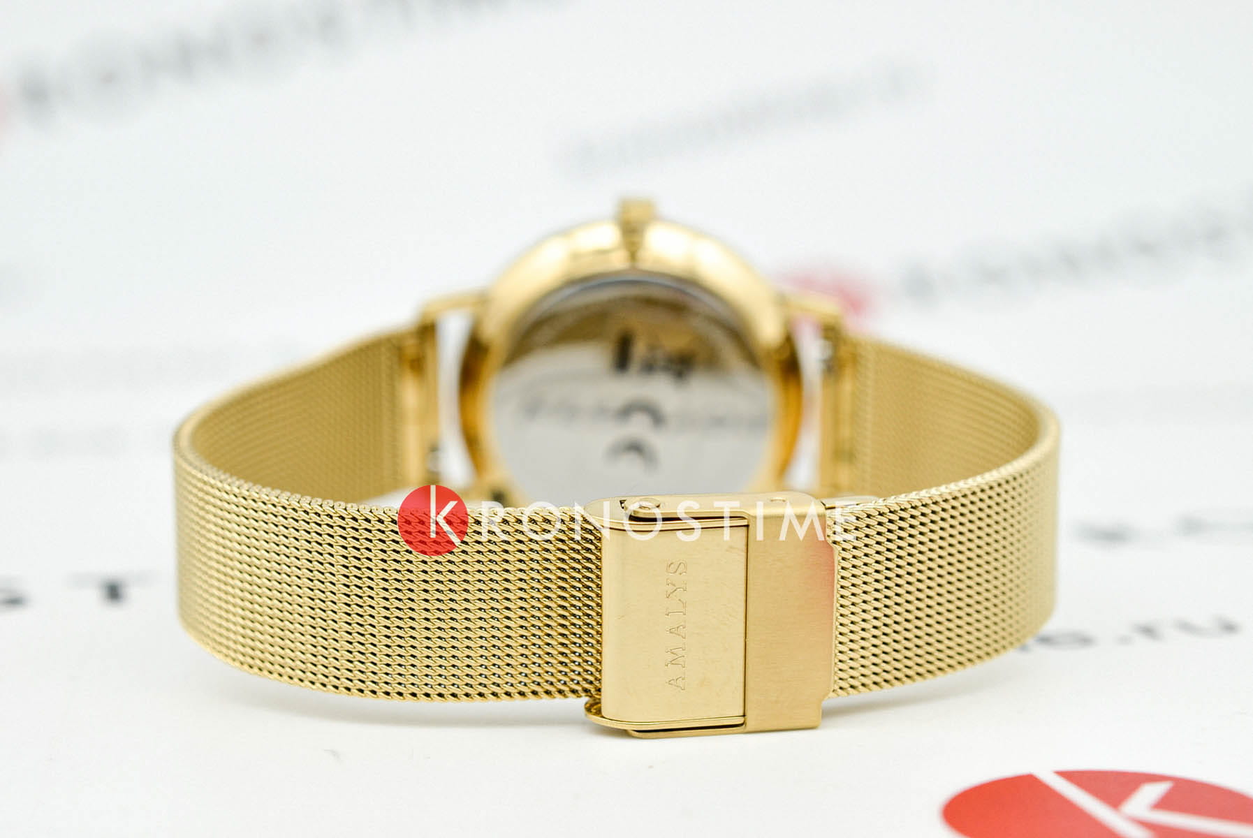 Amalys AMW-173 — женская модель с утончённым классическим дизайном, в которой сочетаются элегантность и практичность. Круглый корпус диаметром 23 мм выполнен из нержавеющей стали с PVD-покрытиемPVDУльтратонкое покрытие наносится в технике вакуумного напыления, сочетает в себе нитрид титана особой прочности со слоем золота или оксида хрома. Несёт в себе декоративную или защитную функцию., гармонирующим с браслетом шириной 16 мм в том же исполнении. Защитную функцию выполняет сапфировое стеклоСапфировое стеклоПрочный и надёжный материал из кристалла сапфира синтетического происхождения, характеризующийся особой твёрдостью и устойчивостью к царапинам и повреждениям., стойкое к царапинам и сохраняющее прозрачность. Механизм — кварцевый, обеспечивающий точность и стабильность хода. Браслет миланского плетения с PVD-покрытиемPVDУльтратонкое покрытие наносится в технике вакуумного напыления, сочетает в себе нитрид титана особой прочности со слоем золота или оксида хрома. Несёт в себе декоративную или защитную функцию. снабжён раскладным замкомРаскладной замокДанный вариант застежки используется только на часах с металлическим браслетом. Отличительная особенность такого крепления в том, что длина браслета становится универсальной и вы можете самостоятельно отрегулировать нужный вам размер – застежка просто двигается по браслету часов., который сочетает надёжность фиксации и удобство повседневного использования. Водозащита 3 ATM защищает часы от случайных брызг и дождя. Циферблат с римскими индексами и изящными стрелками подчёркивает классическую эстетику модели, делая её уместной как в повседневных образах, так и в торжественной обстановке.
