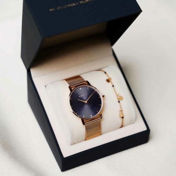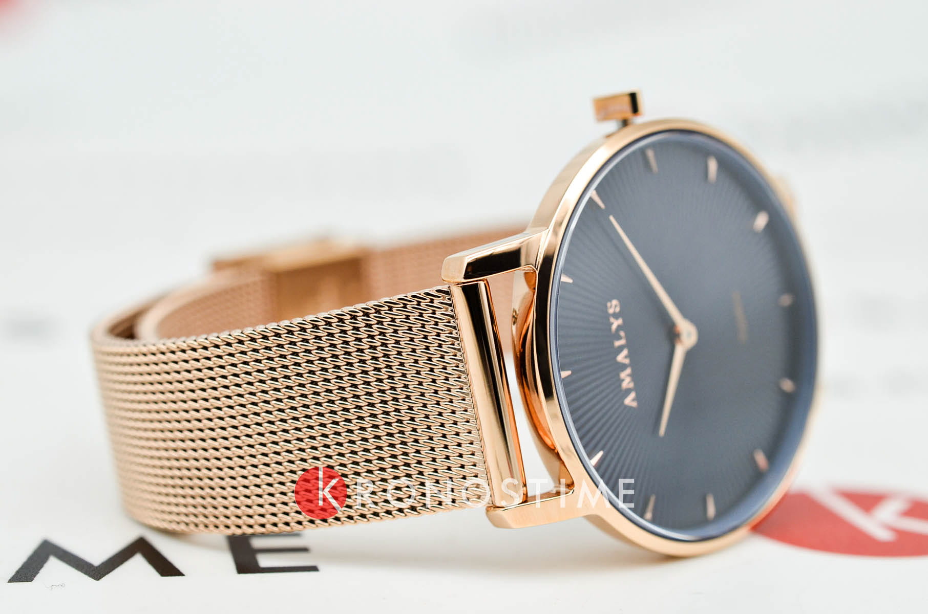 Amalys AMW-192 — женский набор, включающий часы и браслет, выполненный в едином элегантном стиле. Круглый корпус диаметром 33 мм изготовлен из нержавеющей стали с PVDPVDУльтратонкое покрытие наносится в технике вакуумного напыления, сочетает в себе нитрид титана особой прочности со слоем золота или оксида хрома. Несёт в себе декоративную или защитную функцию.-покрытием тёплого золотистого оттенка, что подчёркивает изысканный характер модели. Защитную функцию выполняет сапфировое стеклоСапфировое стеклоПрочный и надёжный материал из кристалла сапфира синтетического происхождения, характеризующийся особой твёрдостью и устойчивостью к царапинам и повреждениям., стойкое к царапинам и сохраняющее прозрачность. Механизм — кварцевый, обеспечивающий точность хода и удобство в использовании. Водозащита 3 ATM защищает от случайных брызг и дождя. Циферблат оформлен в минималистичном стиле с тонкими метками и изящными стрелками, подчёркивающими женственный образ. Стальной браслет миланского плетения с PVDPVDУльтратонкое покрытие наносится в технике вакуумного напыления, сочетает в себе нитрид титана особой прочности со слоем золота или оксида хрома. Несёт в себе декоративную или защитную функцию.-покрытием на раскладном замкеРаскладной замокДанный вариант застежки используется только на часах с металлическим браслетом. Отличительная особенность такого крепления в том, что длина браслета становится универсальной и вы можете самостоятельно отрегулировать нужный вам размер – застежка просто двигается по браслету часов. мягко облегает запястье и гармонично сочетается с корпусом. Дополняющий набор браслет усиливает впечатление цельности и придаёт образу завершённость.
