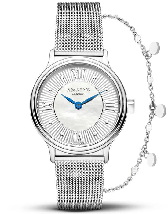 Amalys AMW-197 — женский набор, включающий часы и браслет, выполненный в гармоничном стиле. Круглый корпус диаметром 28 мм изготовлен из нержавеющей стали, а браслет типа «миланская сетка» шириной 14 мм обеспечивает комфортное прилегание и подчёркивает изящный образ. Защитную функцию выполняет сапфировое стеклоСапфировое стеклоПрочный и надёжный материал из кристалла сапфира синтетического происхождения, характеризующийся особой твёрдостью и устойчивостью к царапинам и повреждениям., устойчивое к царапинам и сохраняющее прозрачность. Механизм — кварцевый, надёжный и точный. Браслет снабжён раскладным замкомРаскладной замокДанный вариант застежки используется только на часах с металлическим браслетом. Отличительная особенность такого крепления в том, что длина браслета становится универсальной и вы можете самостоятельно отрегулировать нужный вам размер – застежка просто двигается по браслету часов., что делает ношение удобным и безопасным. Водозащита 5 ATM предохраняет модель от случайных брызг и дождя. Циферблат с римскими индексами и утончённым декоративным узором придаёт часам элегантность, а комплектный браслет завершает цельный и женственный образ.