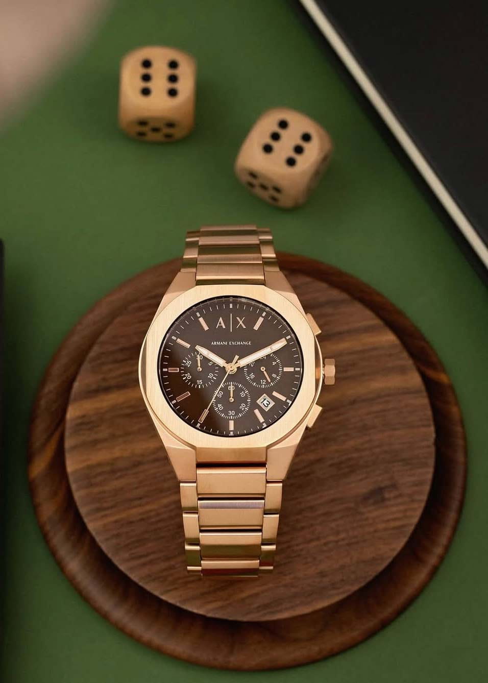 Мужские наручные часы-хронографХронографФункция позволяет измерять отрезки времени с особой точностью: часы, минуты, секунды. Верным признаком хронографа является наличие на циферблате 3 дополнительных окошек-счётчиков. с секундомеромСекундомерСекундоме́р — прибор, способный измерять интервалы времени с точностью до долей секунды. Armani Exchange Rafael AX4188 кварцевый механизм с высокой точностью. Корпус часов изготовлены из нержавеющей стали с IP-покрытиемIP-покрытиеМетод ионного напыления. Демонстрирует повышенную устойчивость к истиранию, окислению и химическим веществам. Под воздействием высокого давления и температуры около 1500°C молекулы металла надёжно соединяются с частицами корпуса часов. цвета розового золота. Минеральное стеклоМинеральное стеклоМинеральное стекло представляет собой искусственно выращенный минерал кварца. Такое стекло отличается особой устойчивостью к повреждениям и царапинам. Уступает по некоторым качествам сапфировому стеклу. защищает их от царапин и повреждений, сохраняя первозданный вид даже при активном использовании. Окошко даты находится в положении между 4 и 5 часов. Стрелки с люминесцентным покрытиемЛюминесцентное покрытиеПозволяет считывать показания времени в темноте. Производители наносят на стрелки, часовые индексы, безель или поверхность циферблата светонакопительный состав, дающий холодное свечение.. 12-ти и 24-х часовой формат времени. Стальной браслет с IP-покрытиемIP-покрытиеМетод ионного напыления. Демонстрирует повышенную устойчивость к истиранию, окислению и химическим веществам. Под воздействием высокого давления и температуры около 1500°C молекулы металла надёжно соединяются с частицами корпуса часов. на раскладной застёжкеРаскладная застёжкаТакой тип застёжки используется только на браслетах из металла. Она никогда не раскрывается полностью, происходит разделение на 2 и более частей. Раскладывающая застёжка снизит вероятность потери часов к минимуму. обеспечивает надежную фиксацию на запястье. Класс водозащиты: 50 метров позволит защитить корпус от случайных брызг или капель дождя. Эта модель – отличный выбор для тех, кто ищет сочетание стиля, качества и функциональности. Часы станут не только полезным аксессуаром, но и выразительным элементом вашего имиджа.