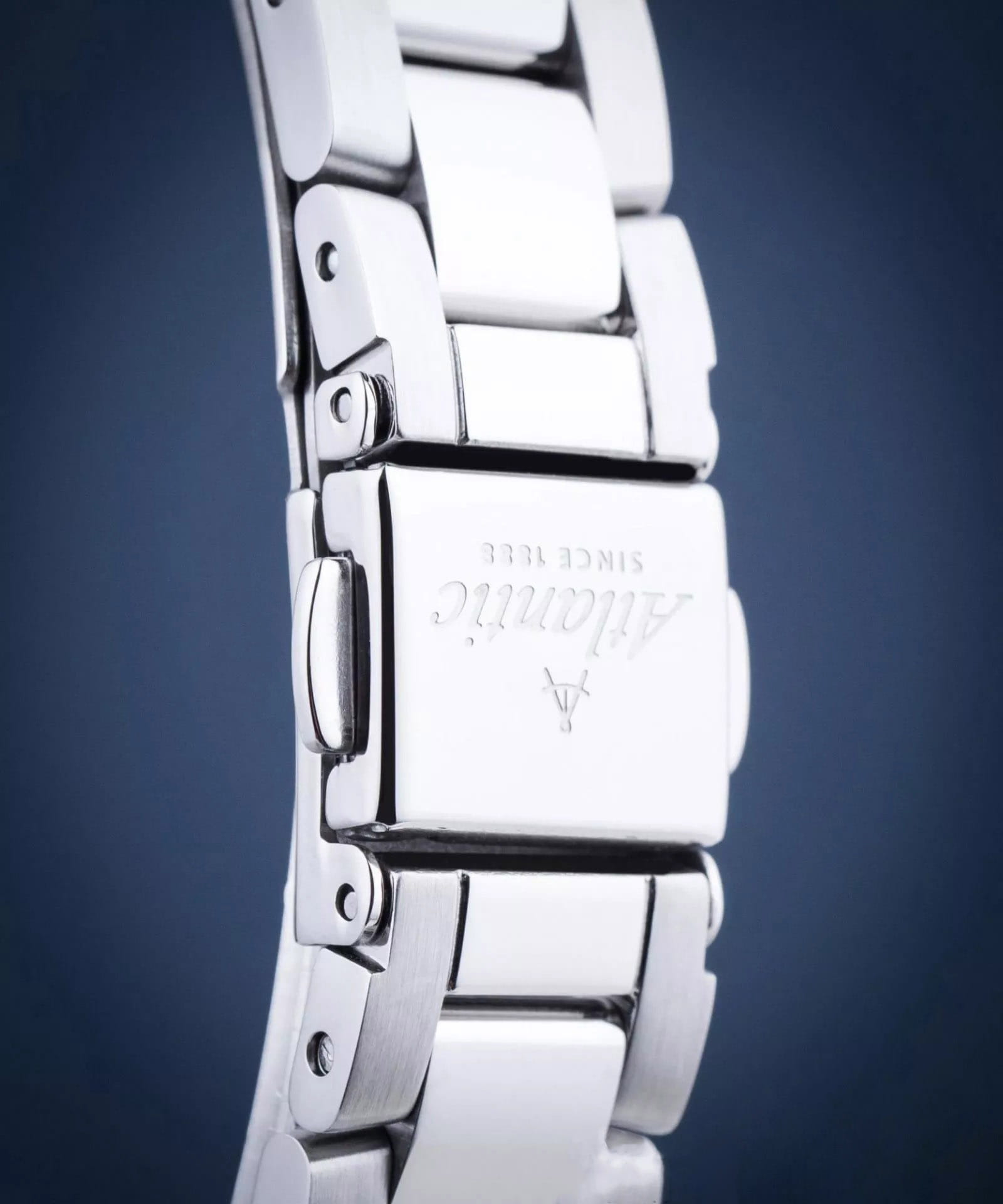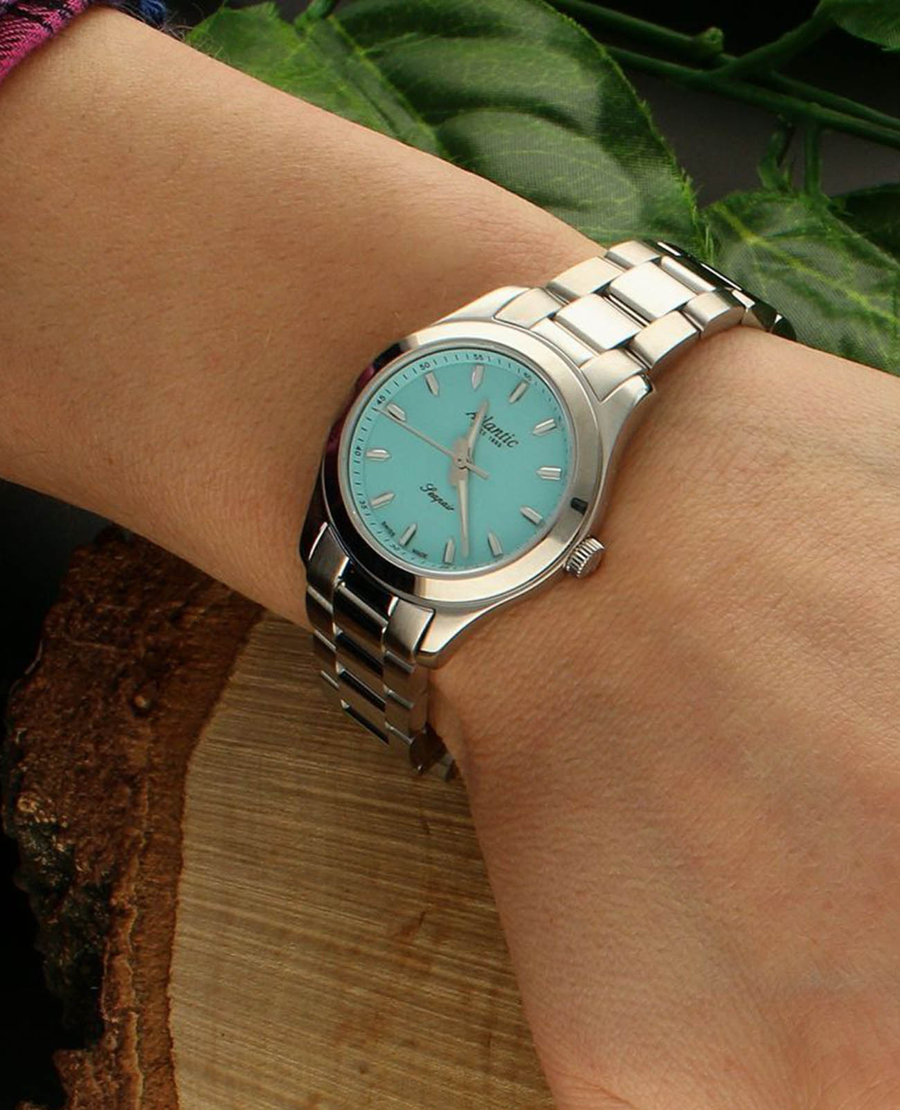 Женские швейцарские часы Atlantic Seapair Ladies 20335.41.91TQ , кварцевый механизм с высокой точностью. Циферблат часов с люминесцентным покрытиемЛюминесцентное покрытиеПозволяет считывать показания времени в темноте. Производители наносят на стрелки, часовые индексы, безель или поверхность циферблата светонакопительный состав, дающий холодное свечение. стрелок и меток, дополнен сапфировым стекломСапфировое стеклоПрочный и надёжный материал из кристалла сапфира синтетического происхождения, характеризующийся особой твёрдостью и устойчивостью к царапинам и повреждениям., устойчивым к появлению царапин и обладающее высокой прозрачностью. Класс водозащиты: 30 метров, позволит защитить корпус от случайных брызг или капель дождя. Корпус часов изготовлен из нержавеющей стали. Стальной браслет с раскладной застёжкойРаскладная застёжкаТакой тип застёжки используется только на браслетах из металла. Она никогда не раскрывается полностью, происходит разделение на 2 и более частей. Раскладывающая застёжка снизит вероятность потери часов к минимуму..