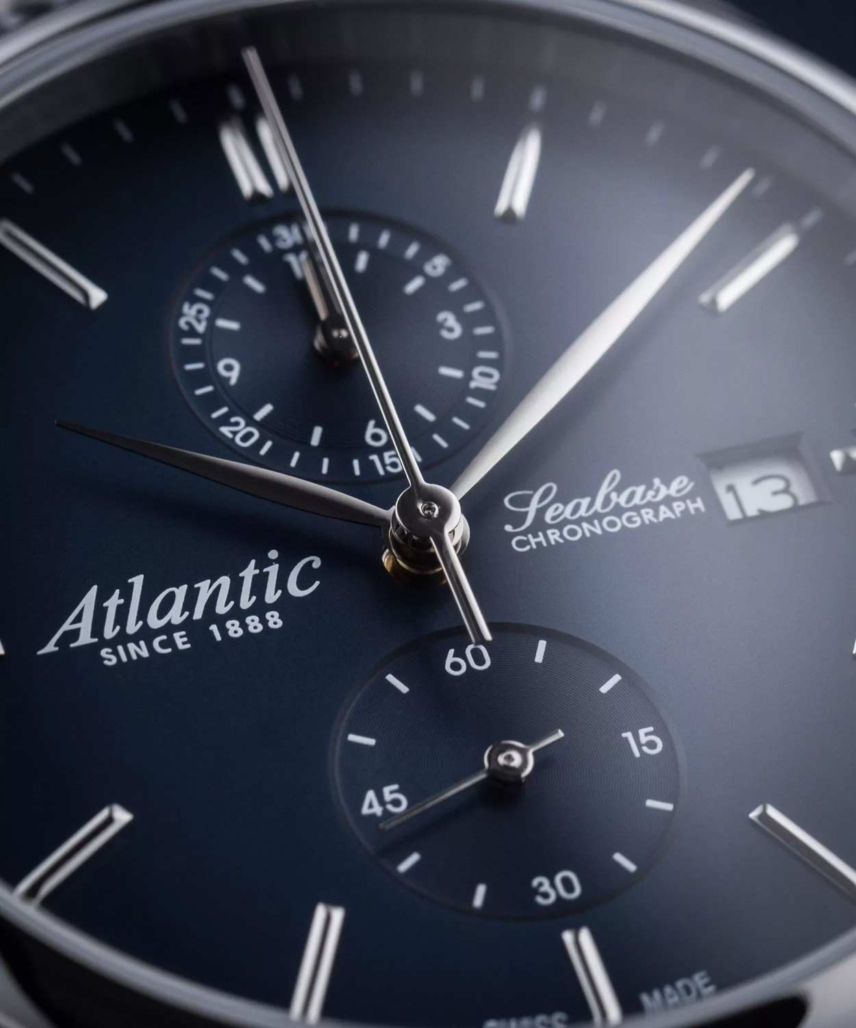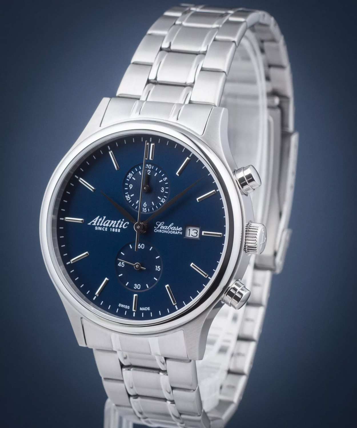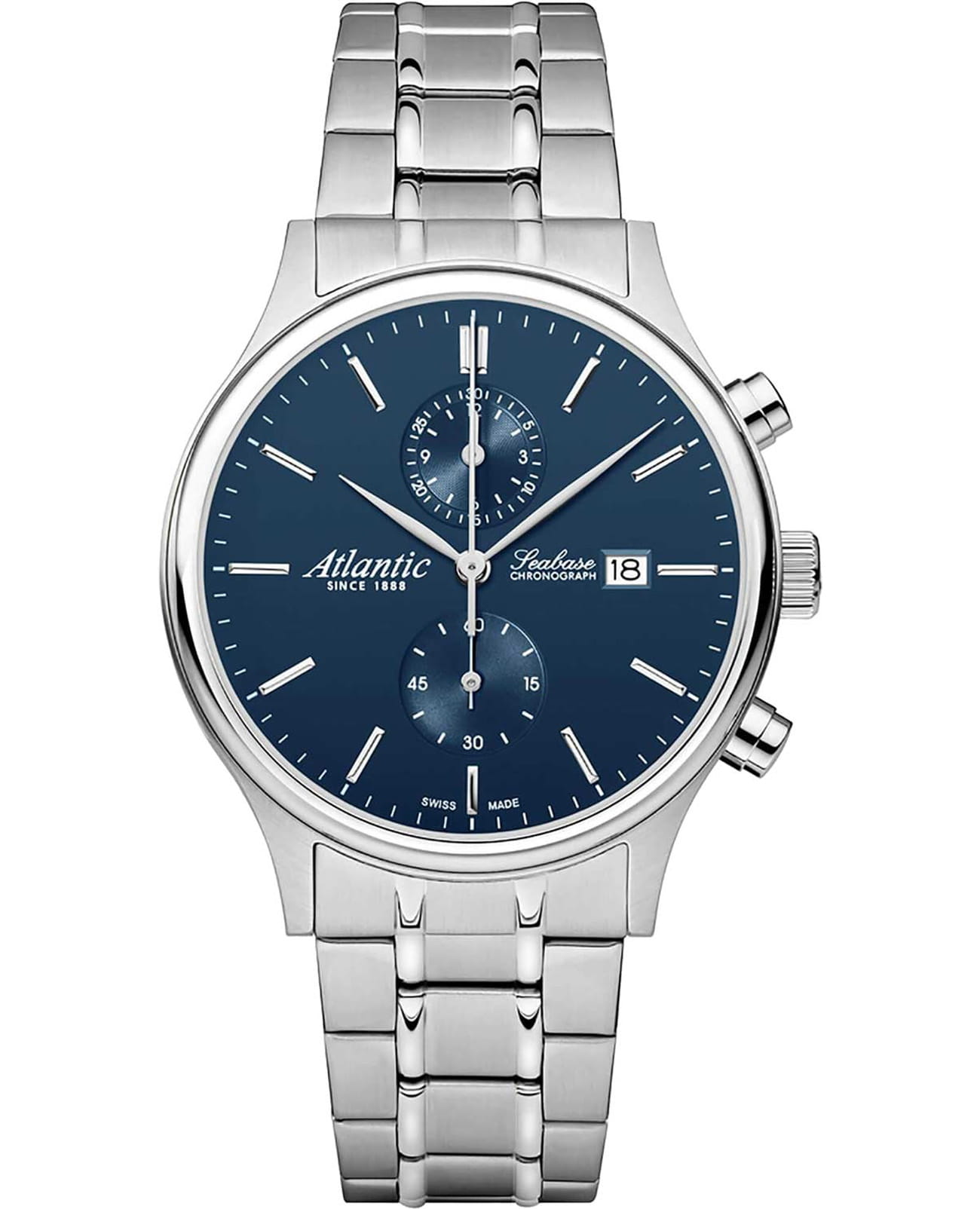 Мужские кварцевые швейцарские часы Atlantic Seabase Quartz Chronograph Edition c хронографомХронографФункция позволяет измерять отрезки времени с особой точностью: часы, минуты, секунды. Верным признаком хронографа является наличие на циферблате 3 дополнительных окошек-счётчиков. 64457.41.51, механизм с высокой точностью. Циферблат часов с сапфировым стекломСапфировое стеклоПрочный и надёжный материал из кристалла сапфира синтетического происхождения, характеризующийся особой твёрдостью и устойчивостью к царапинам и повреждениям., устойчивым к появлению царапин и обладающее высокой прозрачностью. Класс водозащиты: 50 метров, позволит защитить корпус от случайных брызг или капель дождя. Корпус часов изготовлен из нержавеющей стали. Стальной браслет на раскладной застёжкеРаскладная застёжкаТакой тип застёжки используется только на браслетах из металла. Она никогда не раскрывается полностью, происходит разделение на 2 и более частей. Раскладывающая застёжка снизит вероятность потери часов к минимуму.. Окошко даты находится в положении 3 часа.
