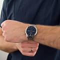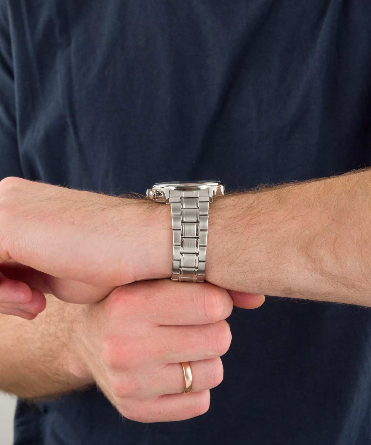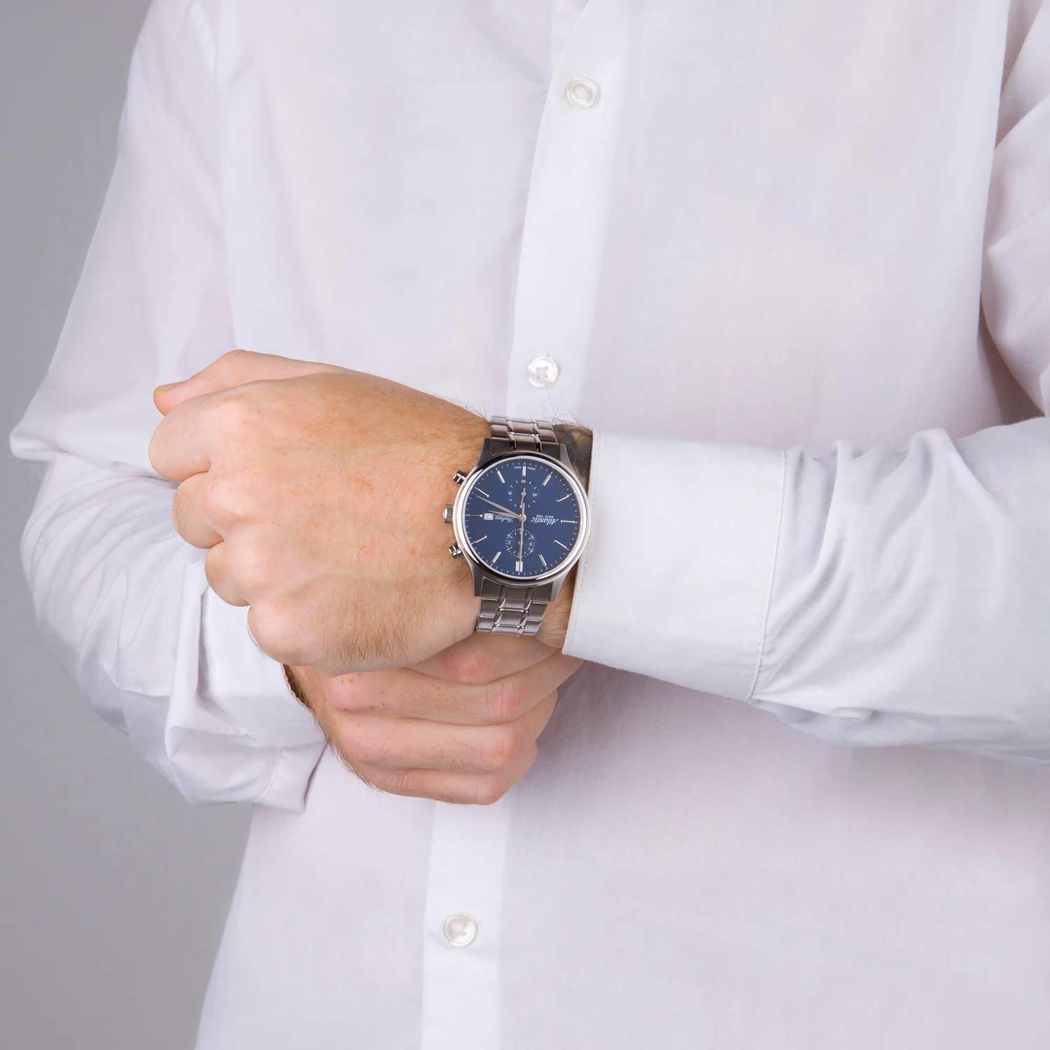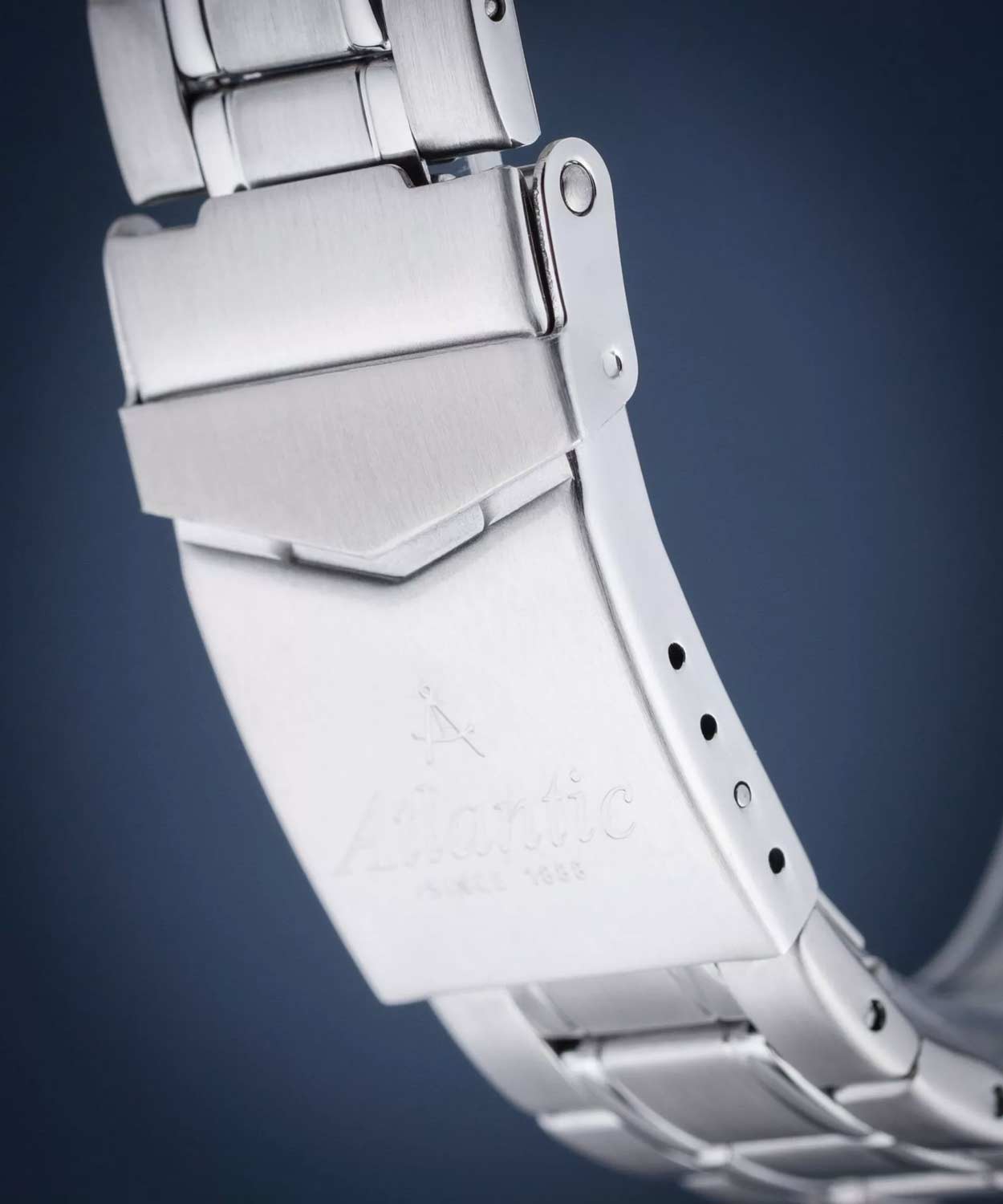 Мужские кварцевые швейцарские часы Atlantic Seabase Quartz Chronograph Edition c хронографомХронографФункция позволяет измерять отрезки времени с особой точностью: часы, минуты, секунды. Верным признаком хронографа является наличие на циферблате 3 дополнительных окошек-счётчиков. 64457.41.51, механизм с высокой точностью. Циферблат часов с сапфировым стекломСапфировое стеклоПрочный и надёжный материал из кристалла сапфира синтетического происхождения, характеризующийся особой твёрдостью и устойчивостью к царапинам и повреждениям., устойчивым к появлению царапин и обладающее высокой прозрачностью. Класс водозащиты: 50 метров, позволит защитить корпус от случайных брызг или капель дождя. Корпус часов изготовлен из нержавеющей стали. Стальной браслет на раскладной застёжкеРаскладная застёжкаТакой тип застёжки используется только на браслетах из металла. Она никогда не раскрывается полностью, происходит разделение на 2 и более частей. Раскладывающая застёжка снизит вероятность потери часов к минимуму.. Окошко даты находится в положении 3 часа.