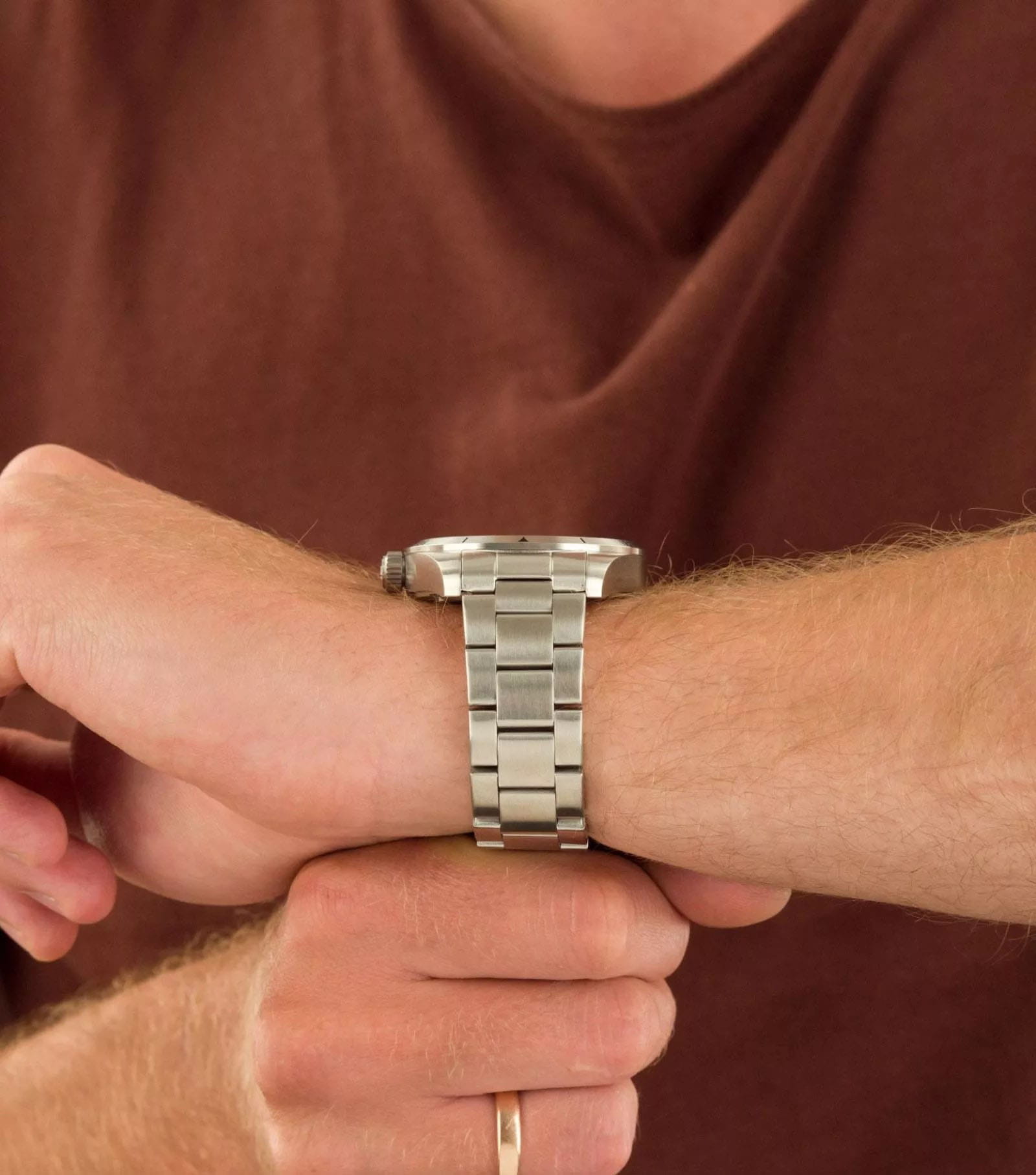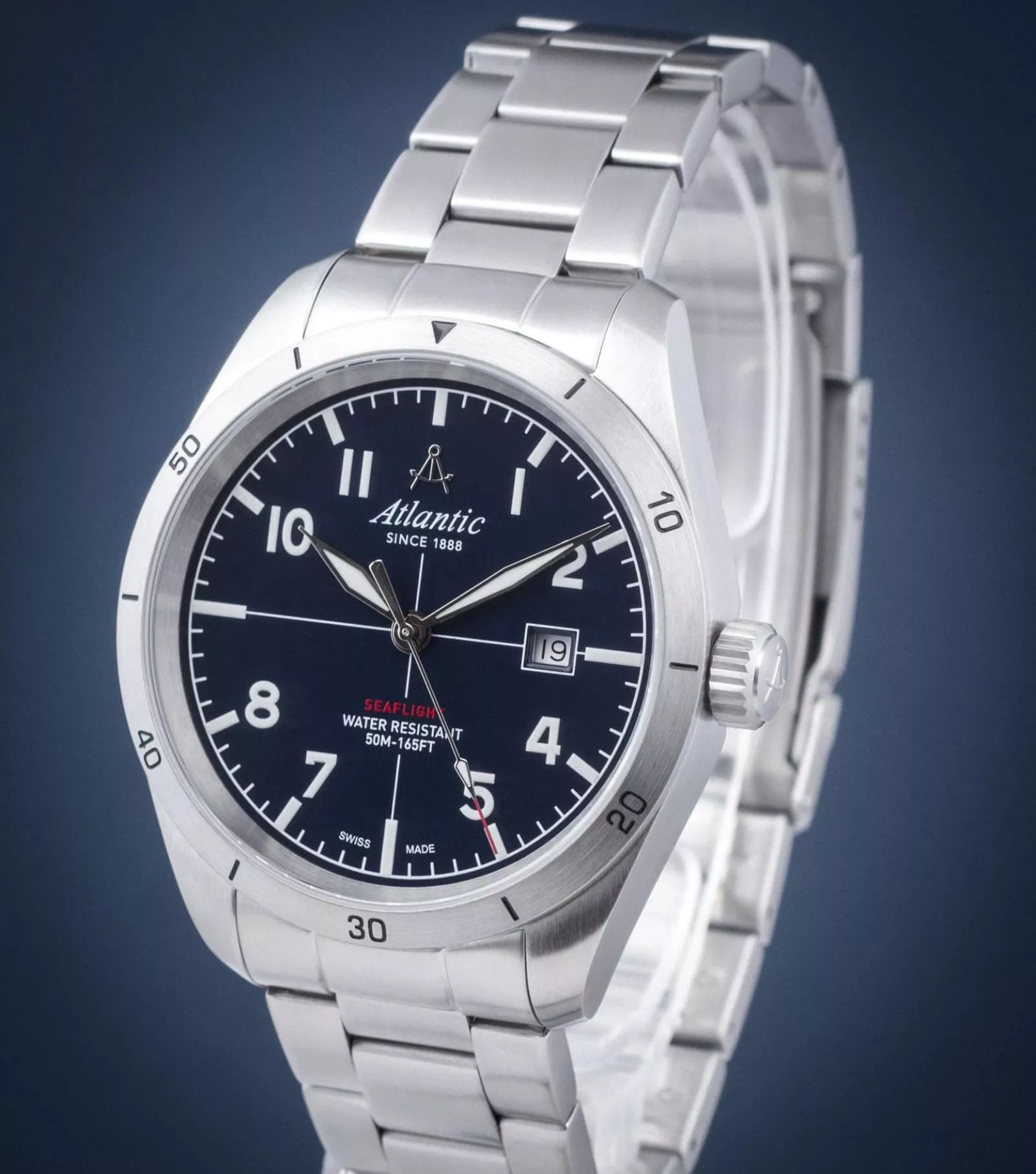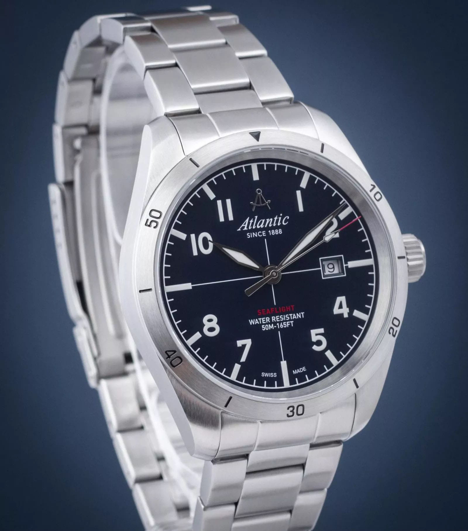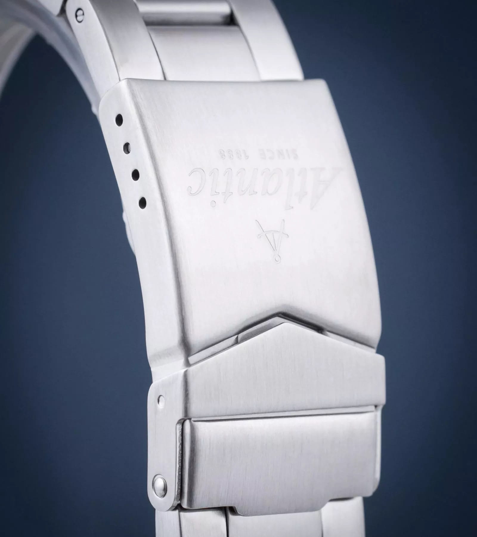 Мужские швейцарские часы Atlantic Seaflight 70356.41.55, кварцевый механизм с высокой точностью. Сапфировое стеклоСапфировое стеклоПрочный и надёжный материал из кристалла сапфира синтетического происхождения, характеризующийся особой твёрдостью и устойчивостью к царапинам и повреждениям. устойчивое к появлению царапин, обладающее высокой прозрачностью. Класс водозащиты: 50 метров, позволит защитить корпус от случайных брызг или капель дождя. Корпус часов изготовлен из стали. Стальной браслет на раскладной застёжкеРаскладная застёжкаТакой тип застёжки используется только на браслетах из металла. Она никогда не раскрывается полностью, происходит разделение на 2 и более частей. Раскладывающая застёжка снизит вероятность потери часов к минимуму.. Окошко даты находится в положении 3 часа. Стрелки и метки с люминесцентным покрытиемЛюминесцентное покрытиеПозволяет считывать показания времени в темноте. Производители наносят на стрелки, часовые индексы, безель или поверхность циферблата светонакопительный состав, дающий холодное свечение..