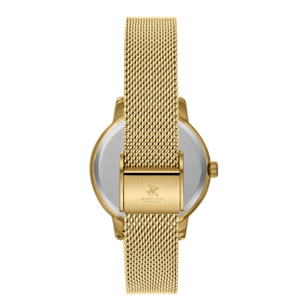 Женские наручные часы Beverly Hills Polo Club BP3734C.120 сочетают в себе элегантный дизайн и надежность современных технологий. Модель обладает круглым корпусом, изготовленным из нержавеющей стали с IP-покрытиемIP-покрытиеМетод ионного напыления. Демонстрирует повышенную устойчивость к истиранию, окислению и химическим веществам. Под воздействием высокого давления и температуры около 1500°C молекулы металла надёжно соединяются с частицами корпуса часов., что обеспечивает долговечность и устойчивость к внешним воздействиям. Для защиты циферблата используется минеральное стеклоМинеральное стеклоМинеральное стекло представляет собой искусственно выращенный минерал кварца. Такое стекло отличается особой устойчивостью к повреждениям и царапинам. Уступает по некоторым качествам сапфировому стеклу., которое эффективно противостоит царапинам. Часы оснащены кварцевым механизмом, гарантирующим точное время без необходимости подзаводки. Водонепроницаемость модели достигает 50 метров (WR 50), что позволяет использовать их при контакте с водой, например, во время мытья рук или дождя. Стальной браслет миланского плетения с IP-покрытиемIP-покрытиеМетод ионного напыления. Демонстрирует повышенную устойчивость к истиранию, окислению и химическим веществам. Под воздействием высокого давления и температуры около 1500°C молекулы металла надёжно соединяются с частицами корпуса часов. на раскладном замкеРаскладной замокДанный вариант застежки используется только на часах с металлическим браслетом. Отличительная особенность такого крепления в том, что длина браслета становится универсальной и вы можете самостоятельно отрегулировать нужный вам размер – застежка просто двигается по браслету часов., обеспечивающей комфортное ношение и безопасность. Диаметр корпуса составляет 35 мм, что делает модель изящной и подходящей для повседневного использования.