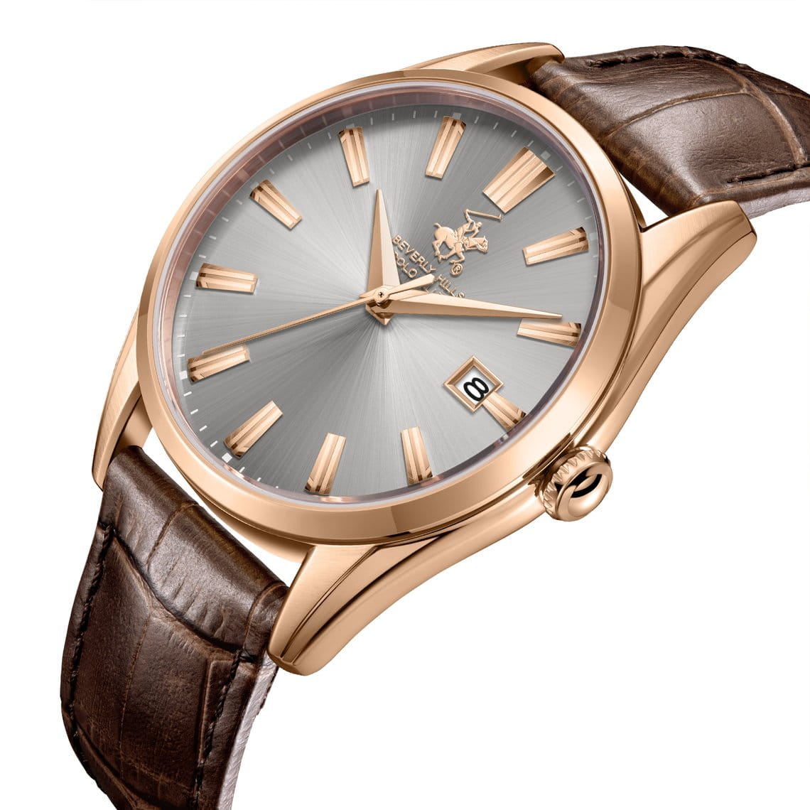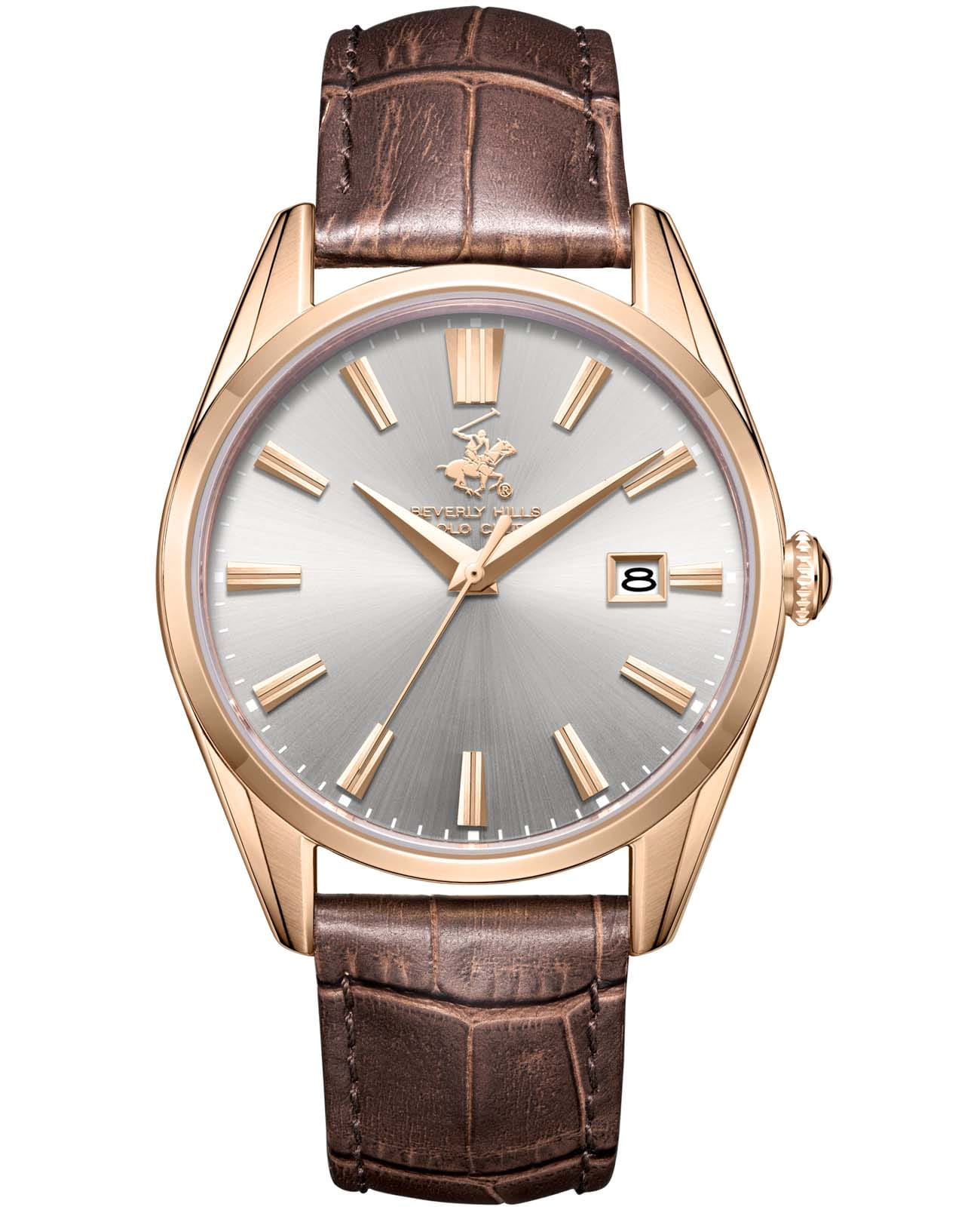 BEVERLY HILLS POLO CLUB BP3811X.462 — стильные мужские часы, сочетающие спортивную динамику и функциональность. Крупный корпус выполнен из нержавеющей стали с IP-покрытиемIP-покрытиеМетод ионного напыления. Демонстрирует повышенную устойчивость к истиранию, окислению и химическим веществам. Под воздействием высокого давления и температуры около 1500°C молекулы металла надёжно соединяются с частицами корпуса часов. цвета розового золота, диаметром 40 мм, гармонично дополнен кожаным ремешком на застёжке-бабочке с кнопкамиЗастёжка "бабочка"Такой вид застёжки дополняется предохранителями, помогающими избежать случайного раскрытия браслета. Обладают изящным исполнением. . Минеральное стеклоМинеральное стеклоМинеральное стекло представляет собой искусственно выращенный минерал кварца. Такое стекло отличается особой устойчивостью к повреждениям и царапинам. Уступает по некоторым качествам сапфировому стеклу. с сапфировым покрытием защищает циферблат от царапин, а кварцевый механизм обеспечивает высокую точность. Благодаря своей универсальной эстетике эти часы уместны и в деловой среде, и в повседневном образе. Окошко даты находится в положении 3 часа. Идеальный выбор для тех, кто ценит элегантный дизайн и качество. Водозащита до 50 метров позволит защитить корпус от случайных брызг или капель дождя.