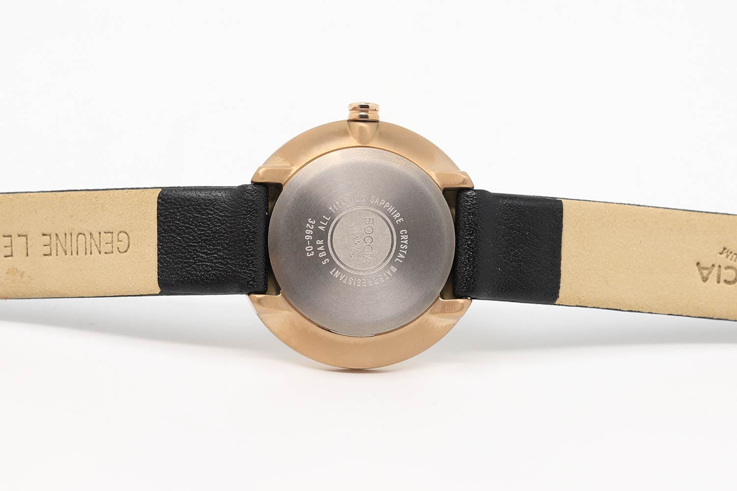 Женские наручные часы Boccia Titanium 3266-03 с надёжным кварцевым механизмом. Корпус часов изготовлен из нержавеющей стали с PVD-покрытиемPVDУльтратонкое покрытие наносится в технике вакуумного напыления, сочетает в себе нитрид титана особой прочности со слоем золота или оксида хрома. Несёт в себе декоративную или защитную функцию.. Кожаный ремешок на стандартной застёжке. Сапфировое стеклоСапфировое стеклоПрочный и надёжный материал из кристалла сапфира синтетического происхождения, характеризующийся особой твёрдостью и устойчивостью к царапинам и повреждениям. устойчивое к мелким механическим повреждениям. Класс водозащиты: 30 метров, позволит защитить корпус от случайных брызг или капель дождя.