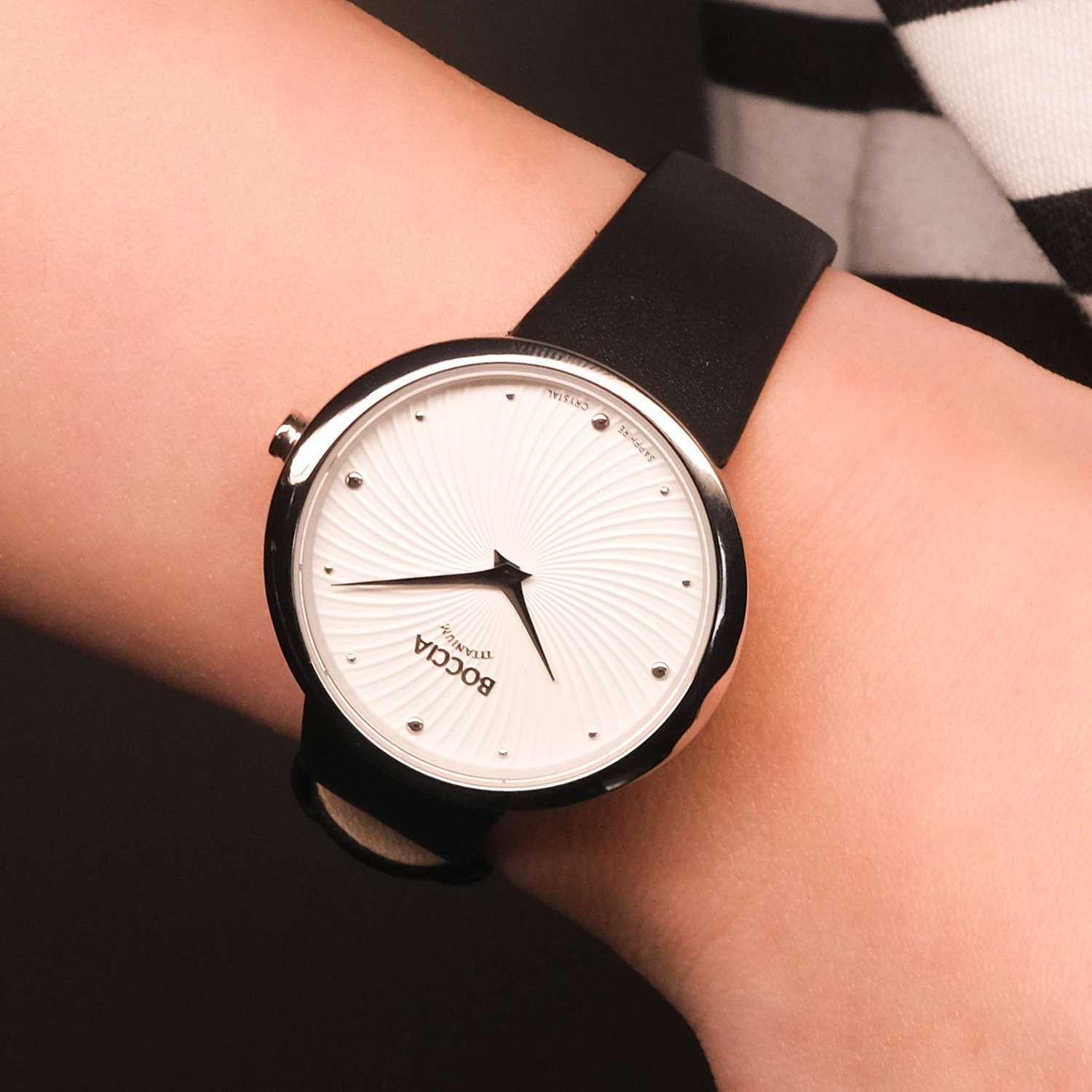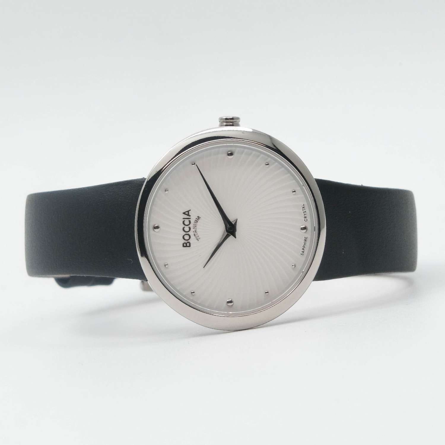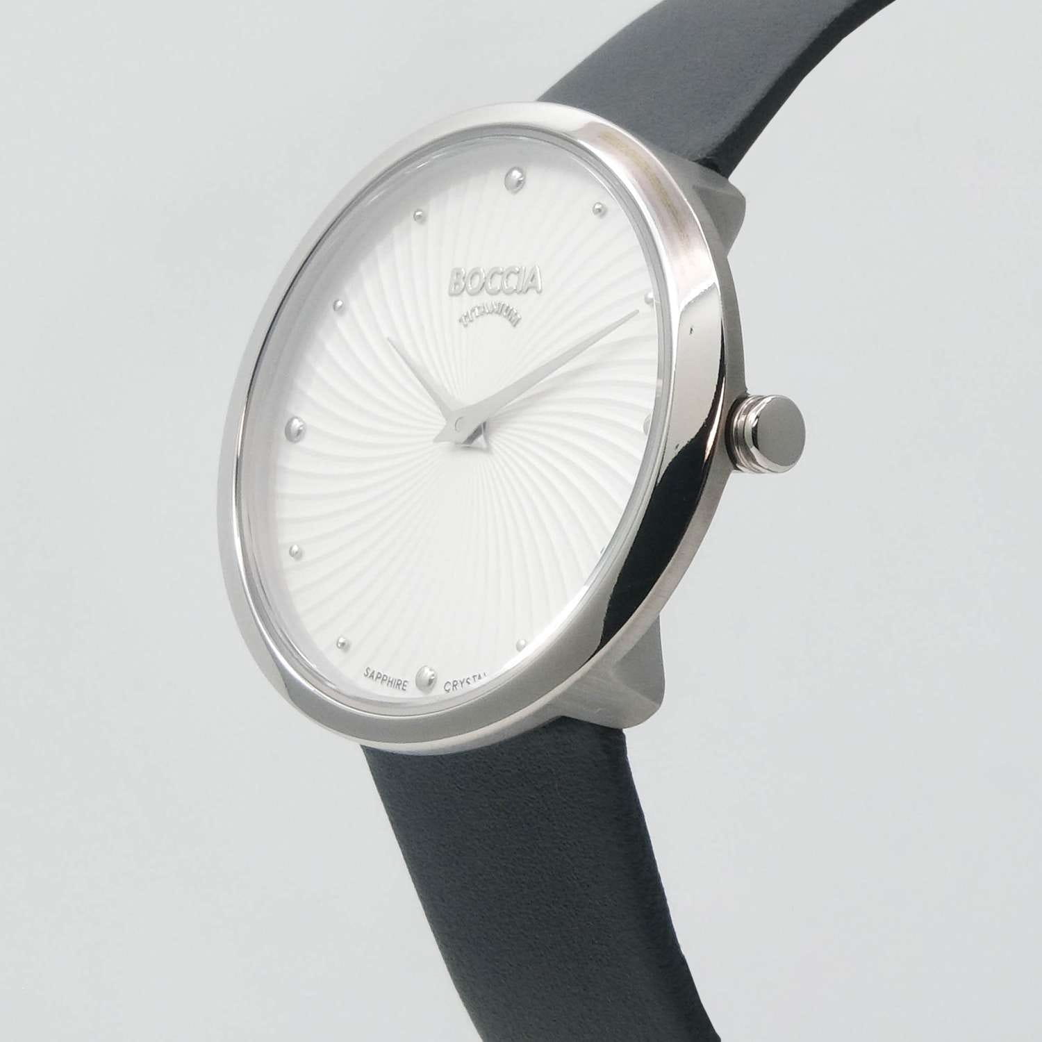 Женские часы Boccia Titanium 3364-01 станут прекрасным дополнением вашего стильного образа. Эти часы оснащены надежным кварцевым механизмом Miyota GL22, обеспечивающим точное время. Центральные часовая и минутная стрелки аккуратно выделяются на белом гильошированном циферблате, придавая часам элегантный вид. Корпус часов выполнен из суперлегкого титана, что делает их не только прочными, но и невероятно комфортными в ношении. Овальная форма корпуса размером 30 х 32 мм добавляет изысканности и утонченности. Черный кожаный ремешок с классической застежкой гармонично дополняет общий стиль часов. Сапфировое стеклоСапфировое стеклоПрочный и надёжный материал из кристалла сапфира синтетического происхождения, характеризующийся особой твёрдостью и устойчивостью к царапинам и повреждениям., устойчивое к появлению царапин, надежно защищает циферблат, обеспечивая долговечность и сохранение первоначального внешнего вида. Водостойкость уровня WR 50 позволяет не беспокоиться о попадании влаги при мытье рук или в дождливую погоду.