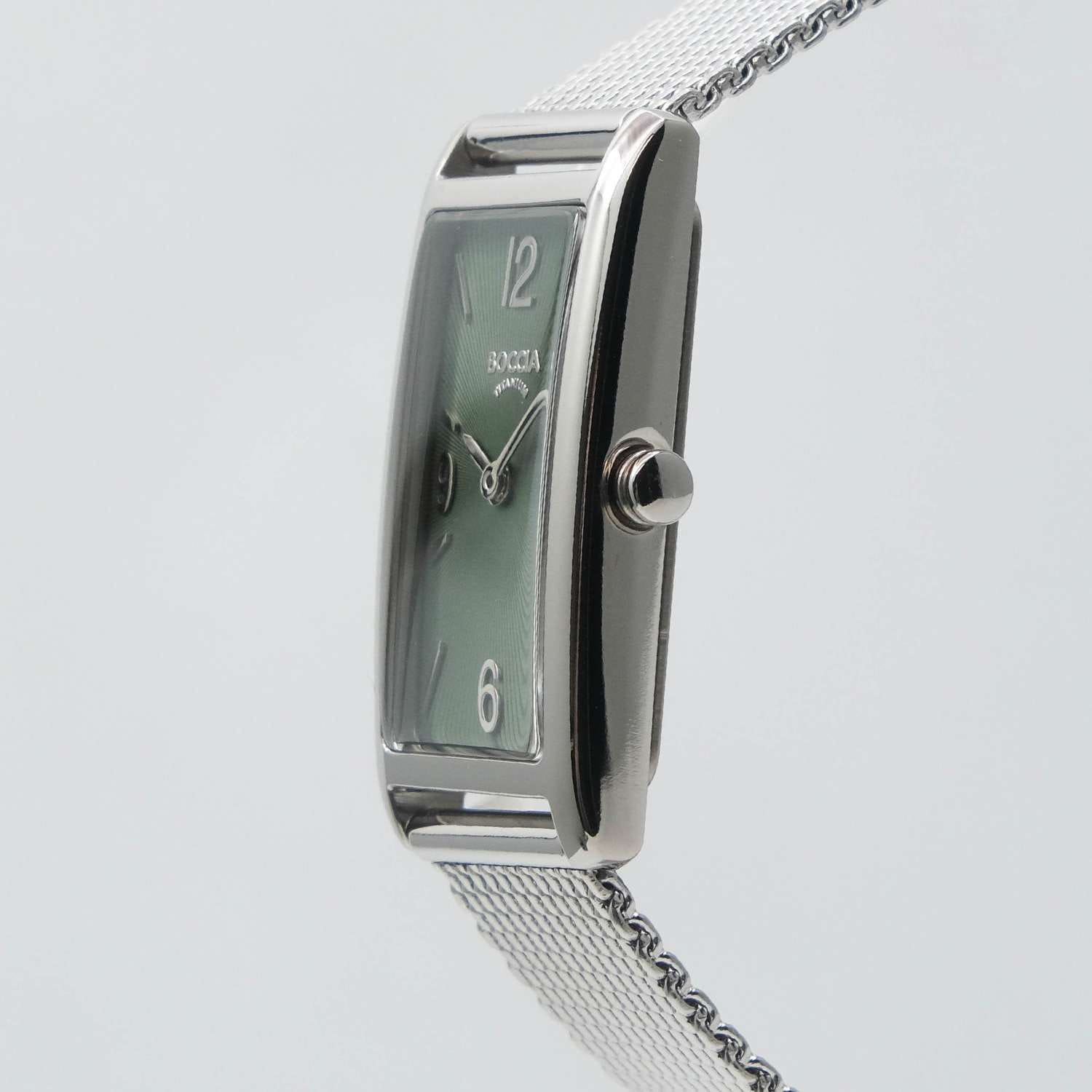 Женские часы Boccia 3366-01, которые станут стильным и функциональным аксессуаром для современной женщины. Эти часы оснащены кварцевым механизмом Miyota 5Y20, обеспечивающим точное и надежное отсчитывание времени. Центральные часовая и минутная стрелки выделяются на элегантном зеленом циферблате, создавая контрастный и выразительный образ. Прямоугольный корпус часов выполнен из суперлегкого титана, что делает их невероятно комфортными для ежедневного ношения. Размер корпуса 35х18 мм добавляет изысканности и утонченности внешнему виду. Особое внимание привлекает стальной браслет, выполненный в технике миланского плетения, который придаёт часам современный и элегантный вид. А раскладной замокРаскладной замокДанный вариант застежки используется только на часах с металлическим браслетом. Отличительная особенность такого крепления в том, что длина браслета становится универсальной и вы можете самостоятельно отрегулировать нужный вам размер – застежка просто двигается по браслету часов. обеспечивает удобство и надежность фиксации. Прочное выпуклое минеральное стеклоМинеральное стеклоМинеральное стекло представляет собой искусственно выращенный минерал кварца. Такое стекло отличается особой устойчивостью к повреждениям и царапинам. Уступает по некоторым качествам сапфировому стеклу. защищает циферблат от мелких механических повреждений, гарантируя долговечность и сохранение первоначального внешнего вида. Водостойкость уровня WR 30 обеспечивает защиту от брызг, делая их подходящими для повседневного использования.