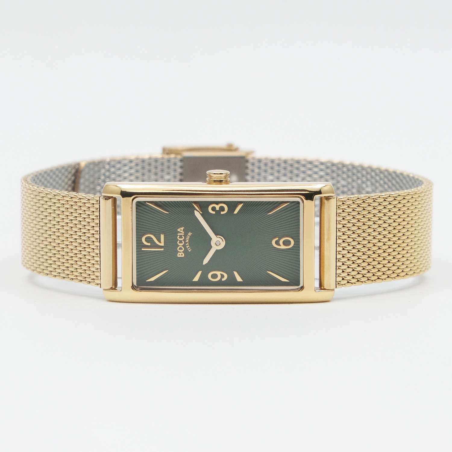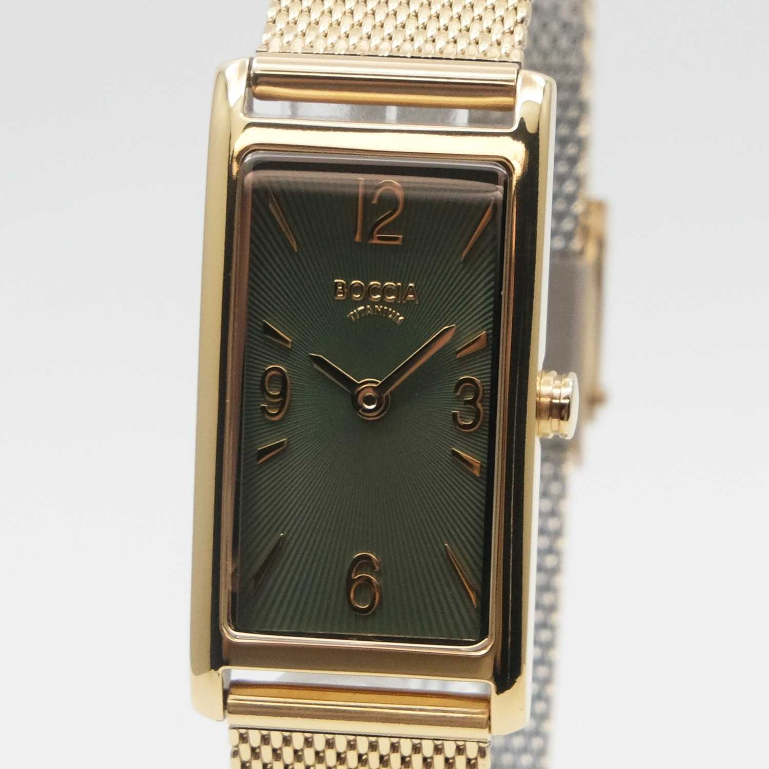 Женские часы Boccia 3366-03, которые станут стильным и функциональным аксессуаром для современной женщины. Эти часы оснащены кварцевым механизмом Miyota 5Y20, обеспечивающим точное и надежное отсчитывание времени. Центральные часовая и минутная стрелки выделяются на элегантном зеленом циферблате, создавая контрастный и выразительный образ. Прямоугольный корпус часов выполнен из суперлегкого титана с PVDPVDУльтратонкое покрытие наносится в технике вакуумного напыления, сочетает в себе нитрид титана особой прочности со слоем золота или оксида хрома. Несёт в себе декоративную или защитную функцию.-покрытием цвета желтого золота, что делает их невероятно комфортными для ежедневного ношения. Размер корпуса 35х18 мм добавляет изысканности и утонченности внешнему виду. Особое внимание привлекает стальной браслет с PVDPVDУльтратонкое покрытие наносится в технике вакуумного напыления, сочетает в себе нитрид титана особой прочности со слоем золота или оксида хрома. Несёт в себе декоративную или защитную функцию.-покрытием цвета желтого золота, выполненный в технике миланского плетения, который придаёт часам современный и элегантный вид. А раскладной замокРаскладной замокДанный вариант застежки используется только на часах с металлическим браслетом. Отличительная особенность такого крепления в том, что длина браслета становится универсальной и вы можете самостоятельно отрегулировать нужный вам размер – застежка просто двигается по браслету часов. обеспечивает удобство и надежность фиксации. Прочное выпуклое минеральное стеклоМинеральное стеклоМинеральное стекло представляет собой искусственно выращенный минерал кварца. Такое стекло отличается особой устойчивостью к повреждениям и царапинам. Уступает по некоторым качествам сапфировому стеклу. защищает циферблат от мелких механических повреждений, гарантируя долговечность и сохранение первоначального внешнего вида. Водостойкость уровня WR 30 обеспечивает защиту от брызг, делая их подходящими для повседневного использования.
