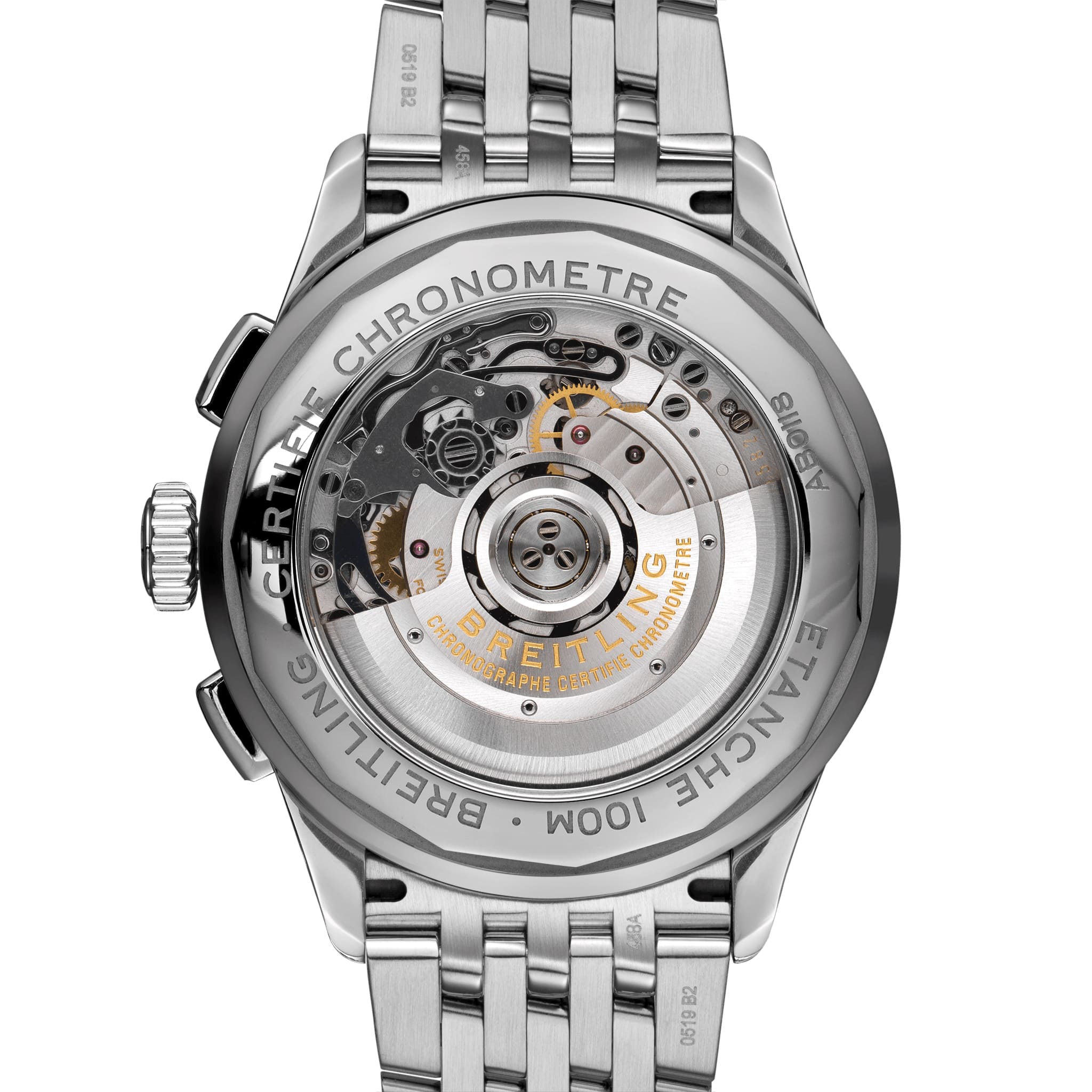 Внутри корпуса спрятан фирменный мануфактурный калибр Breitling Manufacture Caliber 01, сертифицированный Швейцарским институтом официального тестирования хронометров (COSC).