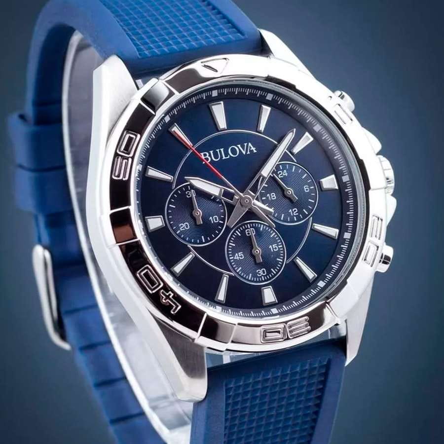 Мужские кварцевые часы-хронографХронографФункция позволяет измерять отрезки времени с особой точностью: часы, минуты, секунды. Верным признаком хронографа является наличие на циферблате 3 дополнительных окошек-счётчиков. Bulova Classic 96K103 – отражающий идеальное сочетание современного дизайна, надёжности и функциональности. Элегантный облик станет превосходным завершением образа, наделив его индивидуальным характером. Корпус из нержавеющей стали диаметром 42 мм идеально сбалансирован и элегантен. Минеральное стеклоМинеральное стеклоМинеральное стекло представляет собой искусственно выращенный минерал кварца. Такое стекло отличается особой устойчивостью к повреждениям и царапинам. Уступает по некоторым качествам сапфировому стеклу. защищает циферблат от царапин и устойчивое к мелким механическим повреждениям.Силиконовый ремешок синего цвета на стандартной застежке обеспечивает комфортное ношение. Стрелки и метки с люминесцентным покрытиемЛюминесцентное покрытиеПозволяет считывать показания времени в темноте. Производители наносят на стрелки, часовые индексы, безель или поверхность циферблата светонакопительный состав, дающий холодное свечение. позволяющие легко определять время даже в темноте. Водозащита 100 метров, позволит плавать, нырять и заниматься другими водными видами спорта. Эта модель – отличный выбор для тех, кто ищет сочетание стиля, качества и функциональности. Часы станут не только полезным аксессуаром, но и выразительным элементом вашего имиджа.