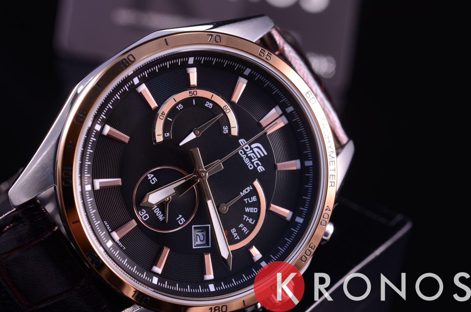 Мужские классические наручные часы Casio Edifice надежные и практичные. Кварцевый японский механизм Miyota. Точность хода не хуже -10 +15 сек./в месяц. Часы оснащены функцией хронографа. Циферблат черного цвета с контрастными, позолоченными индексами. Стрелки и индексы с светонакопительным нанесением. Корпус выполнен из нержавеющей стали с частичным IP покрытием. Ремешок из натуральной кожи, коричневого цвета, с удобной застежкой. Минеральное стекло устойчиво к появлению царапин. Водонепроницаемость 100М. В часах можно плавать.