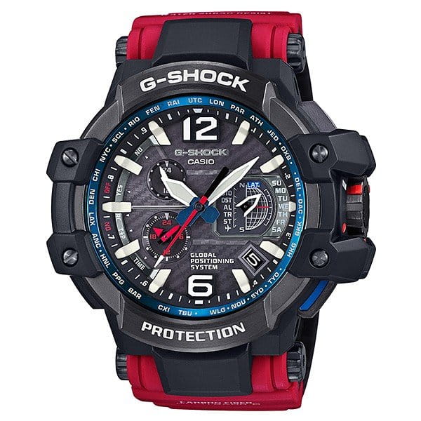 Флагманская модель с красным карбоновым ремешком из серии G-SHOCK GPW — это первые в мире часы с GPS- и радио-синхронизацией времени с атомными часами в разных частях света.