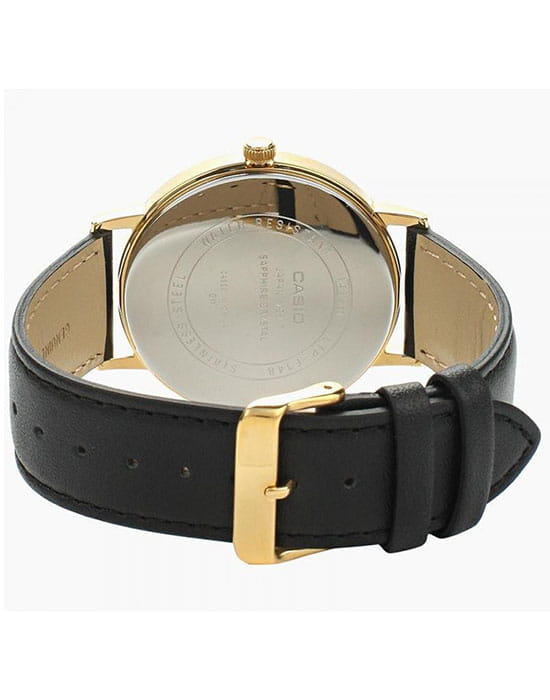 Удобные, стильные наручные часы от Casio являются воплощением практичности и элегантного дизайна. Круглый, золотой корпус выполнен из нержавеющей стали. Стильный черный ремень сделан из натуральной кожи. Сохранность часов обеспечивается прочным сапфировым стеклом. Временные отметки представлены в виде золотистых штрихов. Миниатюрная секундная стрелка вынесена на отдельный циферблат. Тип механизма - кварцевый. Вес аксессуара равен 40 граммам.