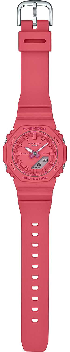 Женские кварцевые часы Casio G-Shock GMA-P2100-4ADR (GMA-P2100-4A). Корпус часов изготовлен из пластика. Стрелки с люминесцентным покрытиемЛюминесцентное покрытиеПозволяет считывать показания времени в темноте. Производители наносят на стрелки, часовые индексы, безель или поверхность циферблата светонакопительный состав, дающий холодное свечение.. Водозащита: 200 метров, позволит плавать, нырять и заниматься другими водными видами спорта. Минеральное стеклоМинеральное стеклоМинеральное стекло представляет собой искусственно выращенный минерал кварца. Такое стекло отличается особой устойчивостью к повреждениям и царапинам. Уступает по некоторым качествам сапфировому стеклу. устойчивое к появлению царапин, обладающее высокой прозрачностью. Необритовое светонакопительное покрытие обеспечивает длительное послесвечение в темноте даже после кратковременного нахождения на свету. 12-ти и 24-х часовой формат времени. Секундомер с двумя точностями показаний: 1/100с (до 1ч) и 1с (после 1ч) и временем измерения 24ч. SPLIT-хронограф. Таймер обратного отсчета от 1с до 24ч. Мировое время – 48 городов (31 часовой пояс), всемирное координированное время (UTC). Пластиковый ремешок с классической застежкой.