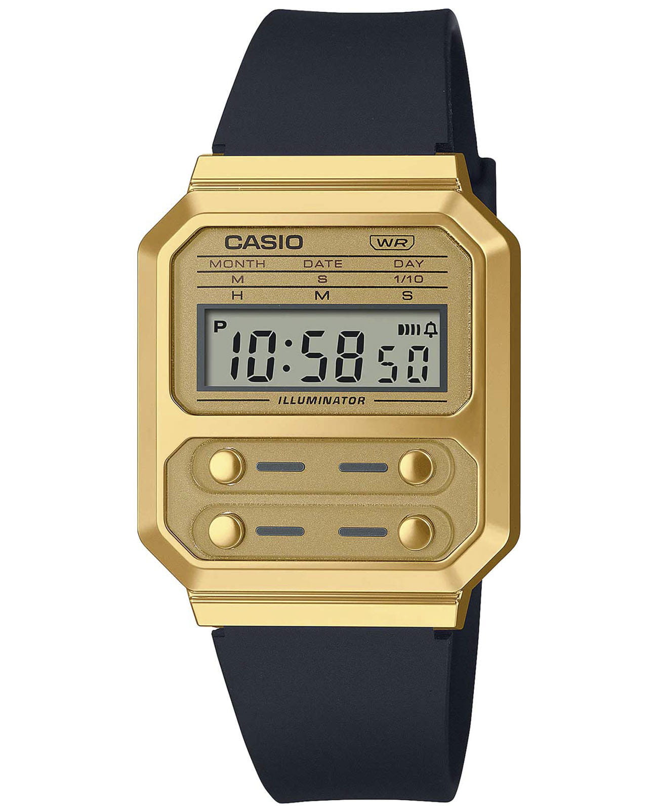 Японские наручные часы с хронографом Casio Vintage A100WEFG-9AEF, кварцевый механизм с высокой точностью. Класс водозащиты: 30 метров, позволит защитить корпус от случайных брызг или капель дождя. Корпус часов изготовлен из пластика, золотого цвета. Часы являются копией модели F-100, которая была первой моделью Casio в пластиковом корпусе. Отличительной чертой часов являются 4 кнопки на лицевой панели. ХронографХронографФункция позволяет измерять отрезки времени с особой точностью: часы, минуты, секунды. Верным признаком хронографа является наличие на циферблате 3 дополнительных окошек-счётчиков.. Циферблат подсвечивается светодиодом. Цвет подсветки: оранжевый. СекундомерСекундомерСекундоме́р — прибор, способный измерять интервалы времени с точностью до долей секунды. с точностью показаний 1/10с и временем измерения 1ч. Батарея рассчитана на 3 года. Водонепроницаемость в соответствии с DIN 8310/ISO 2281. Ремешок с классической застежкой.