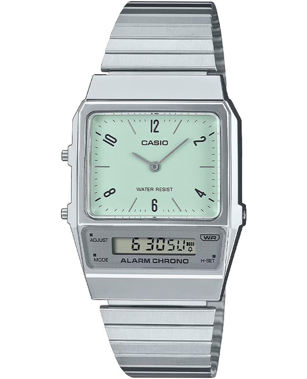 Спортивные японские унисекс часы с секундомеромСекундомерСекундоме́р — прибор, способный измерять интервалы времени с точностью до долей секунды. Casio Vintage AQ-800E-7ADF (AQ-800E-7A2), кварцевый механизм с высокой точностью. Класс водозащиты: 30 метров, позволит защитить корпус от случайных брызг или капель дождя. Корпус часов изготовлен из пластика серебристого цвета. На белом циферблате центральные часовая и минутная стрелки. Отдельно вынесен дополнительный циферблат мирового времениМировое время Полезное часовое усложнение, отображающее время в основных городах и известных областях по всему миру, оно связано с часовыми поясами, удобно для путешественников и бизнесменов. , позволяющий одновременно отобразить время двух часовых поясов . У модели присутствуют функции секундомераСекундомерСекундоме́р — прибор, способный измерять интервалы времени с точностью до долей секунды. с точностью 1/100 секунды и пределом измерения 1 час, ежедневного будильникаБудильникБуди́льник — часы, в заданный момент времени подающие звуковой, световой и/или в редких случаях другой сигнал.. Стальной браслет на раскладной застёжкеРаскладная застёжкаТакой тип застёжки используется только на браслетах из металла. Она никогда не раскрывается полностью, происходит разделение на 2 и более частей. Раскладывающая застёжка снизит вероятность потери часов к минимуму..