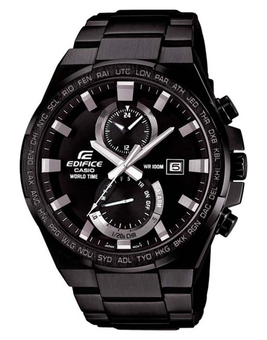 Мужские часы на стальном браслете с будильником и вторым временем. Casio Edifice EFR-542BK-1A, кварцевый механизм с высокой точностью. Класс водозащиты: 100 метров, позволит плавать, нырять и заниматься другими водными видами спорта. Корпус часов изготовлен из стали, черного цвета.