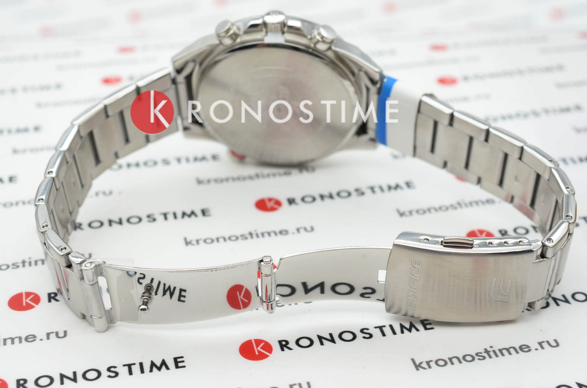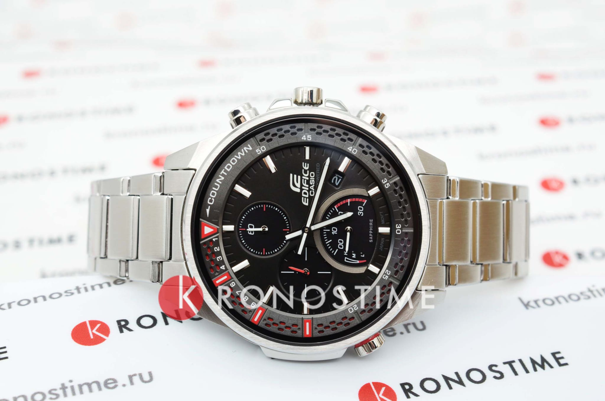Спортивные мужские часы на солнечной батарее c хронографомХронографФункция позволяет измерять отрезки времени с особой точностью: часы, минуты, секунды. Верным признаком хронографа является наличие на циферблате 3 дополнительных окошек-счётчиков. Casio Edifice EFS-S590D-1A, кварцевый механизм с высокой точностью. Сапфировое стеклоСапфировое стеклоПрочный и надёжный материал из кристалла сапфира синтетического происхождения, характеризующийся особой твёрдостью и устойчивостью к царапинам и повреждениям. устойчивое к появлению царапин, обладающее высокой прозрачностью. Класс водозащиты: 100 метров, позволит плавать, нырять и заниматься другими водными видами спорта. Корпус часов изготовлен из стали. Литой стальной браслет на раскладной застёжкеРаскладная застёжкаТакой тип застёжки используется только на браслетах из металла. Она никогда не раскрывается полностью, происходит разделение на 2 и более частей. Раскладывающая застёжка снизит вероятность потери часов к минимуму., расстегиваемая одним касанием. Время работы аккумулятора без подзарядки - 6 месяцев. Подсветка NeobriteПодсветка NeobriteИспользование светонакопительных составов на основе сульфида цинка или алюмината стронция, яркий свет можно наблюдать на протяжении 6-10 часов после «зарядки» часов около источника света. обеспечивает длительное послесвечение в темноте даже после кратковременного нахождения на свету. Часы-хронографХронографФункция позволяет измерять отрезки времени с особой точностью: часы, минуты, секунды. Верным признаком хронографа является наличие на циферблате 3 дополнительных окошек-счётчиков.  с секундомеромСекундомерСекундоме́р — прибор, способный измерять интервалы времени с точностью до долей секунды. точностью 1с и временем измерения 30мин. Ретроградный указатель минутной стрелки хронографаХронографФункция позволяет измерять отрезки времени с особой точностью: часы, минуты, секунды. Верным признаком хронографа является наличие на циферблате 3 дополнительных окошек-счётчиков.. Вращающийся внутренний безельБезельВнешний ободок, закрепляющий стекло. В спортивных часах так называется поворотное кольцо с делениями на циферблате, выполняет роль таймера – замеряет отрезки времени на шкале. Неподвижный безель – элемент декора. Однонаправленно вращающийся безель на дайверских часах позволяет фиксировать моменты погружения и выныривания на поверхность. со шкалой обратного отсчета. Метки в виде штрихов. Окошко даты находится в положении 4 часа. Заводная головка с защитой. Водонепроницаемость в соответствии с ISO 2281. Предохранительная защелка на браслете препятствует случайному расстегиванию.
