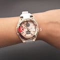 Аксессуар с белым фактурным циферблатом наделён противоударным корпусомУдаропрочный корпусМеханизм заключён в корпус, выполненный из современных материалов, устойчивых к ударам, механическим повреждениям и падению с высоты: инновационный пластик, карбон, нержавеющая сталь, титан. из полимерного пластика. Для усиления устойчивости к ударам безельБезельВнешний ободок, закрепляющий стекло. В спортивных часах так называется поворотное кольцо с делениями на циферблате, выполняет роль таймера – замеряет отрезки времени на шкале. Неподвижный безель – элемент декора. Однонаправленно вращающийся безель на дайверских часах позволяет фиксировать моменты погружения и выныривания на поверхность. сделан из хирургической стали 316L. IP-покрытиеIP-покрытиеМетод ионного напыления. Демонстрирует повышенную устойчивость к истиранию, окислению и химическим веществам. Под воздействием высокого давления и температуры около 1500°C молекулы металла надёжно соединяются с частицами корпуса часов. цвета розового золота защищает от царапин. Японский кварцевый механизм. Полимерный ремешок с узорчатой поверхностью. Минеральное стекло с закалкой. Водозащита до 10 бар. ЛюминесцентнаяЛюминесцентное покрытиеПозволяет считывать показания времени в темноте. Производители наносят на стрелки, часовые индексы, безель или поверхность циферблата светонакопительный состав, дающий холодное свечение. и светодиодная подсветкаСветодиодная подсветкаСветодиодная или LED-подсветка обеспечивает появление яркого холодного свечения за счёт LED-элементов - маленьких лампочек. Они потребляют минимальное количество энергии, чаще всего можно встретить 1 светодиод, в нижней части циферблата.. Будильник, таймер, секундомер с точностью в 1/100 секунды, хронографХронографФункция позволяет измерять отрезки времени с особой точностью: часы, минуты, секунды. Верным признаком хронографа является наличие на циферблате 3 дополнительных окошек-счётчиков., ежечасный сигнал, мировое времяМировое время Полезное часовое усложнение, отображающее время в основных городах и известных областях по всему миру, оно связано с часовыми поясами, удобно для путешественников и бизнесменов. . Габариты: 45,1 x 40,3 x 12,4 мм.