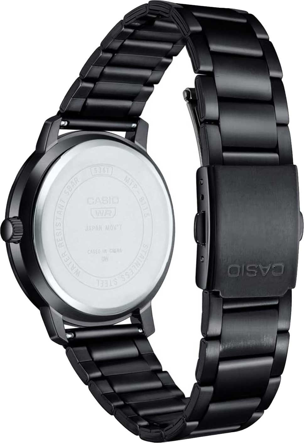 Японские мужские часы с минеральным стекломМинеральное стеклоМинеральное стекло представляет собой искусственно выращенный минерал кварца. Такое стекло отличается особой устойчивостью к повреждениям и царапинам. Уступает по некоторым качествам сапфировому стеклу. Casio Collection MTP-B115B-1E, кварцевый механизм с высокой точностью. Корпус и браслет часов изготовлены из стали IP-покрытиемIP-покрытиеМетод ионного напыления. Демонстрирует повышенную устойчивость к истиранию, окислению и химическим веществам. Под воздействием высокого давления и температуры около 1500°C молекулы металла надёжно соединяются с частицами корпуса часов.. Браслет с раскладной застёжкойРаскладная застёжкаТакой тип застёжки используется только на браслетах из металла. Она никогда не раскрывается полностью, происходит разделение на 2 и более частей. Раскладывающая застёжка снизит вероятность потери часов к минимуму..