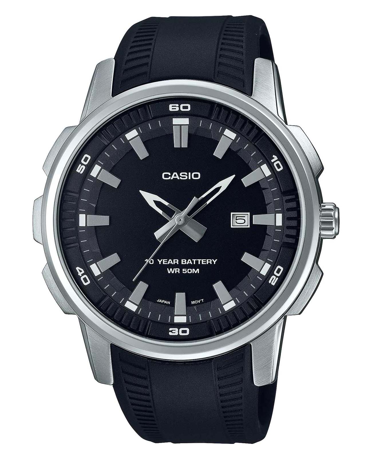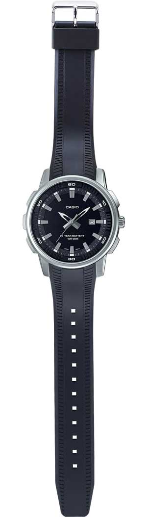 Японские мужские наручные часы с минеральным стекломМинеральное стеклоМинеральное стекло представляет собой искусственно выращенный минерал кварца. Такое стекло отличается особой устойчивостью к повреждениям и царапинам. Уступает по некоторым качествам сапфировому стеклу. Casio Collection MTP-E195-1А, кварцевый механизм с высокой точностью. Класс водозащиты: 50 метров, позволит защитить корпус от случайных брызг или капель дождя. Корпус часов изготовлен из стали. Пластиковый ремешок на стандартной застёжке. Циферблат с метками в виде штрихов. Окошко даты находится в положении 3 часа. Задняя крышка с винтовым фиксатором. Стрелки и метки с люминесцентным покрытиемЛюминесцентное покрытиеПозволяет считывать показания времени в темноте. Производители наносят на стрелки, часовые индексы, безель или поверхность циферблата светонакопительный состав, дающий холодное свечение..