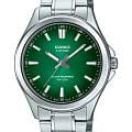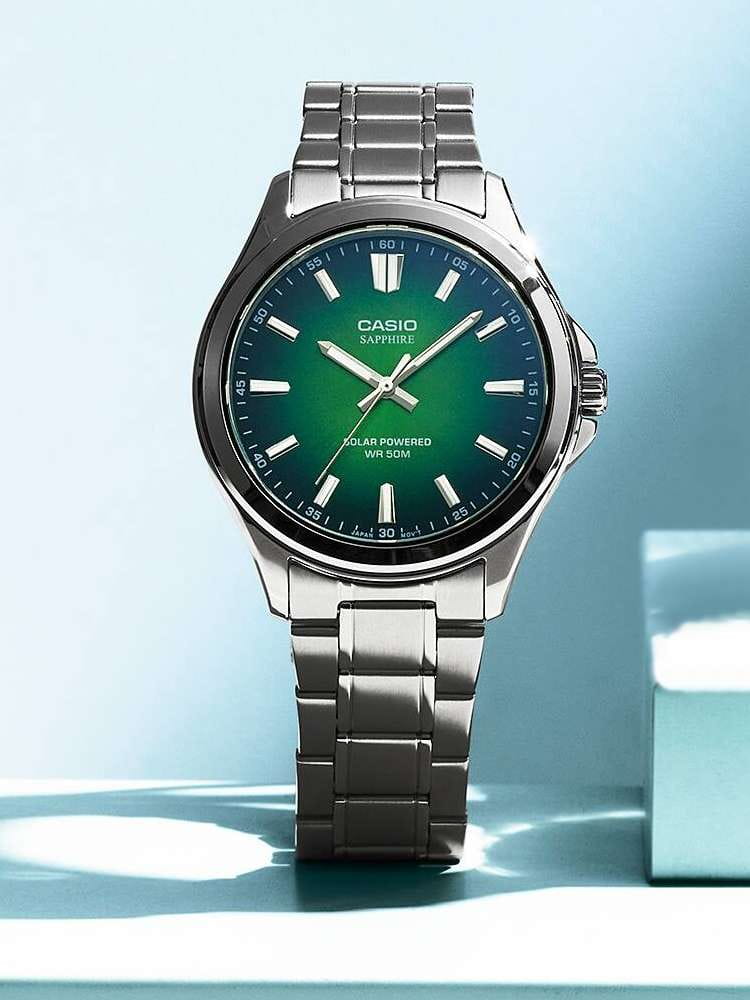 Мужские кварцевые часы Casio Collection — это современный и практичный аксессуар с питанием от солнечной энергии. Корпус размером 41,7 мм и толщиной 9,5 мм выполнен из нержавеющей стали. Циферблат зелёного цвета оформлен штрихами и стрелками. Циферблат защищён сапфировым стекломСапфировое стеклоПрочный и надёжный материал из кристалла сапфира синтетического происхождения, характеризующийся особой твёрдостью и устойчивостью к царапинам и повреждениям. с антибликовым покрытиемАнтибликовое покрытиеСлой оксида металла в 0,13-0,3 микрон, благодаря которому стекло часов не бликует и не отражает свет. Антибликовое покрытие уменьшает отражение света в 10 раз, обеспечивая отличную читаемость показателей циферблата.. Механизм — японский кварцевый калибр Miyota с центральной секундной стрелкой. Часы оснащены стальным браслетом из нержавеющей стали на раскладной застёжкеРаскладная застёжкаТакой тип застёжки используется только на браслетах из металла. Она никогда не раскрывается полностью, происходит разделение на 2 и более частей. Раскладывающая застёжка снизит вероятность потери часов к минимуму.. Заводная головка с защитой повышает надёжность. Водонепроницаемость 50 м позволяет использовать часы при мытье рук или в дождь. Идеальный выбор для тех, кто ценит японское качество и универсальный дизайн.