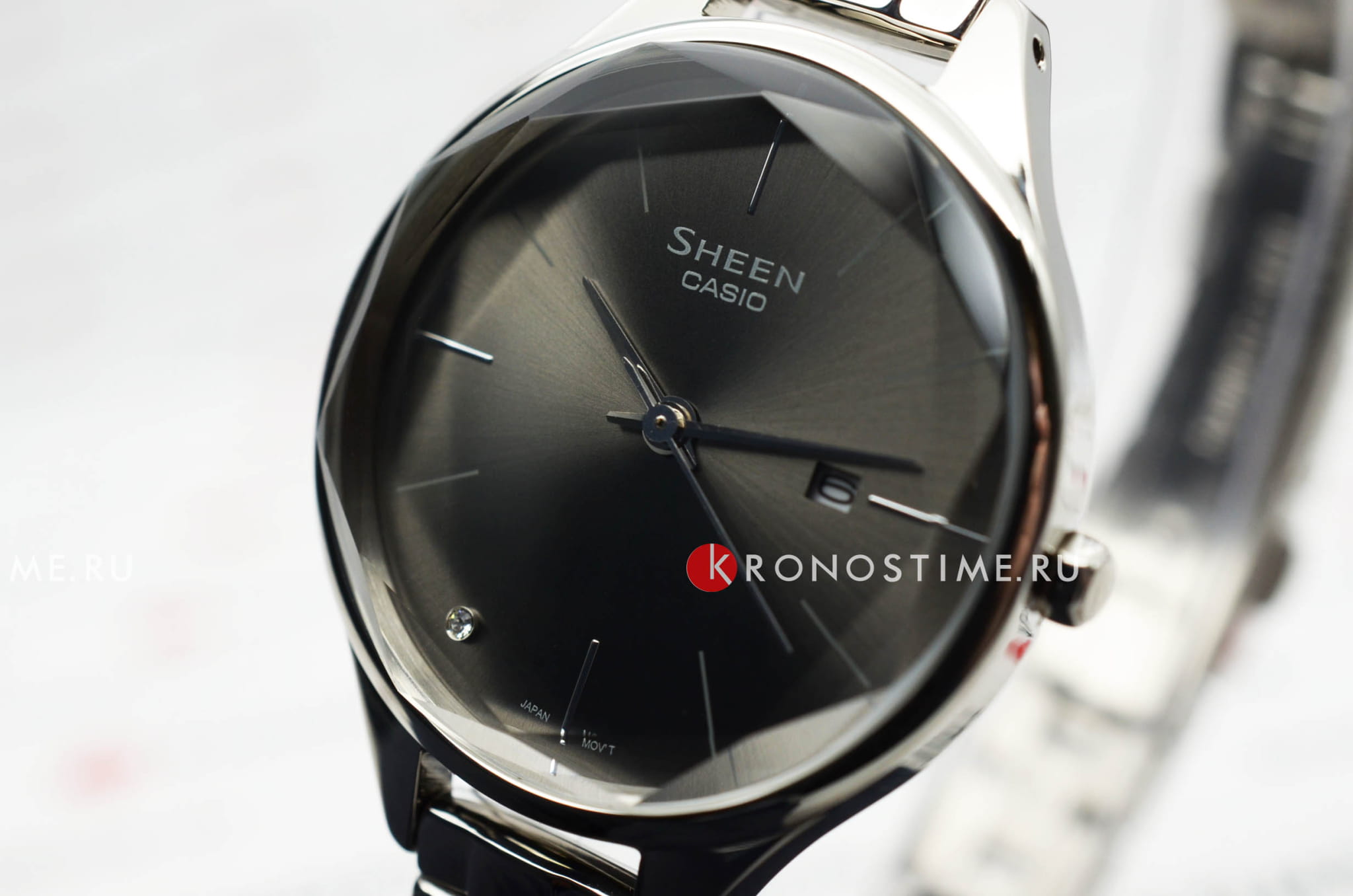 Женские японские наручные часы с минеральным стекломМинеральное стеклоМинеральное стекло представляет собой искусственно выращенный минерал кварца. Такое стекло отличается особой устойчивостью к повреждениям и царапинам. Уступает по некоторым качествам сапфировому стеклу. Casio Sheen SHE-4062D-8A, кварцевый механизм с высокой точностью. Класс водозащиты: 50 метров, позволит защитить корпус от случайных брызг или капель дождя. Корпус часов изготовлен из стали, серебристого цвета. Циферблат часов, украшенный кристаллом, защищен изящным граненым стеклом. Браслет с раскладной застёжкойРаскладная застёжкаТакой тип застёжки используется только на браслетах из металла. Она никогда не раскрывается полностью, происходит разделение на 2 и более частей. Раскладывающая застёжка снизит вероятность потери часов к минимуму.
