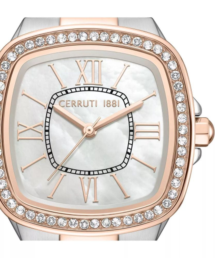 Cerruti 1881 CIWLG0086001 — утончённые женские часы, в которых изысканная гармония форм сочетается с благородным блеском деталей. Корпус из нержавеющей стали, а безельБезельВнешний ободок, закрепляющий стекло. В спортивных часах так называется поворотное кольцо с делениями на циферблате, выполняет роль таймера – замеряет отрезки времени на шкале. Неподвижный безель – элемент декора. Однонаправленно вращающийся безель на дайверских часах позволяет фиксировать моменты погружения и выныривания на поверхность. с IP-покрытиемIP-покрытиеМетод ионного напыления. Демонстрирует повышенную устойчивость к истиранию, окислению и химическим веществам. Под воздействием высокого давления и температуры около 1500°C молекулы металла надёжно соединяются с частицами корпуса часов., украшенный сияющими кристаллами, придаёт модели ювелирное очарование. Перламутровый циферблат с римскими цифрами и гильошированной текстурой создаёт ощущение глубины и мягкого света. Прочное минеральное стеклоМинеральное стеклоМинеральное стекло представляет собой искусственно выращенный минерал кварца. Такое стекло отличается особой устойчивостью к повреждениям и царапинам. Уступает по некоторым качествам сапфировому стеклу. защищает циферблат от повреждений, а металлический браслет с IP-покрытиемIP-покрытиеМетод ионного напыления. Демонстрирует повышенную устойчивость к истиранию, окислению и химическим веществам. Под воздействием высокого давления и температуры около 1500°C молекулы металла надёжно соединяются с частицами корпуса часов. с полированными звеньями оснащён застёжкой «бабочка»Застёжка "бабочка"Такой вид застёжки дополняется предохранителями, помогающими избежать случайного раскрытия браслета. Обладают изящным исполнением. , обеспечивающей элегантное прилегание и комфорт в носке. Cerruti 1881 — воплощение итальянской изысканности и женственности, идеально подходящее для утончённого образа в любой ситуации.