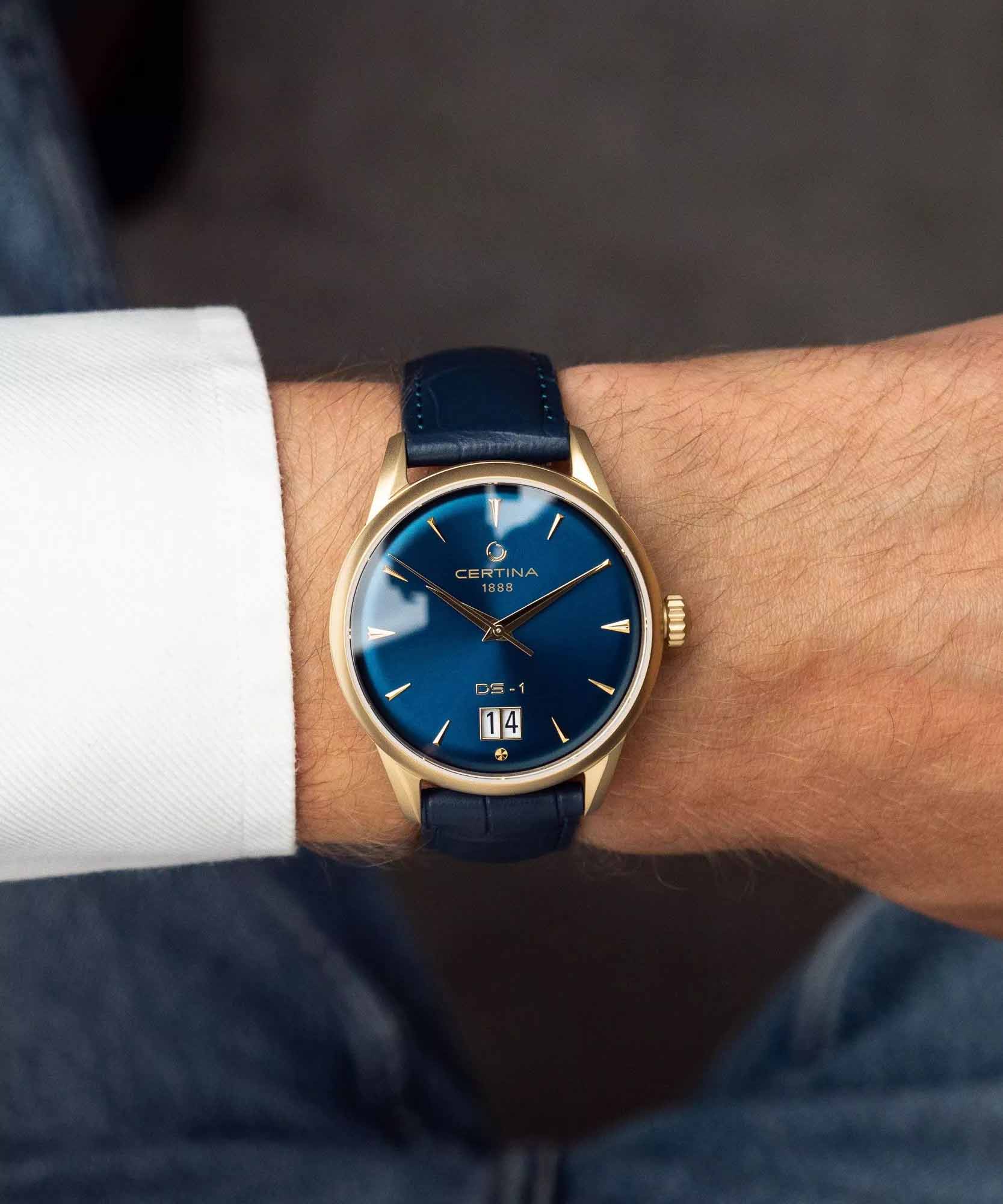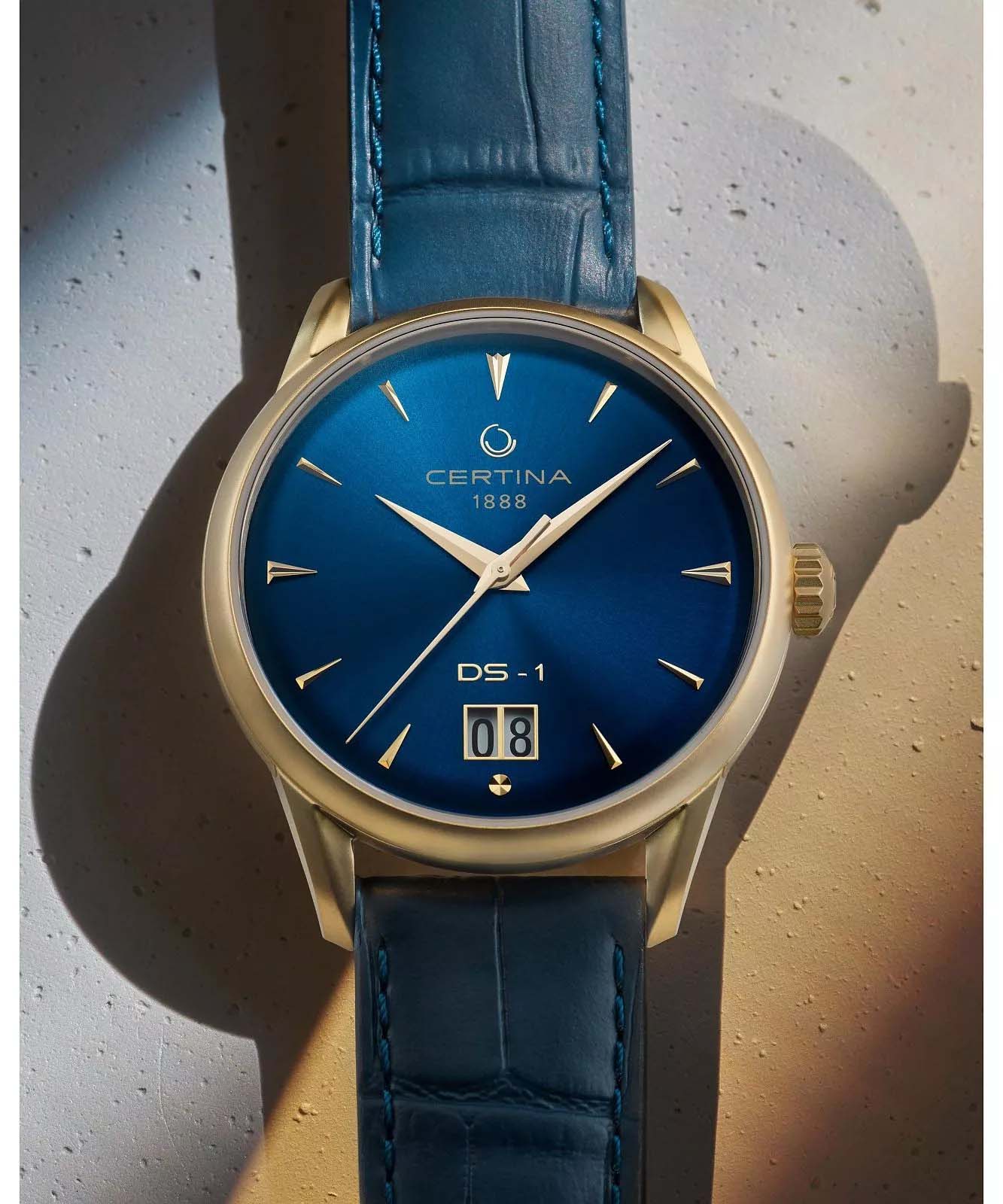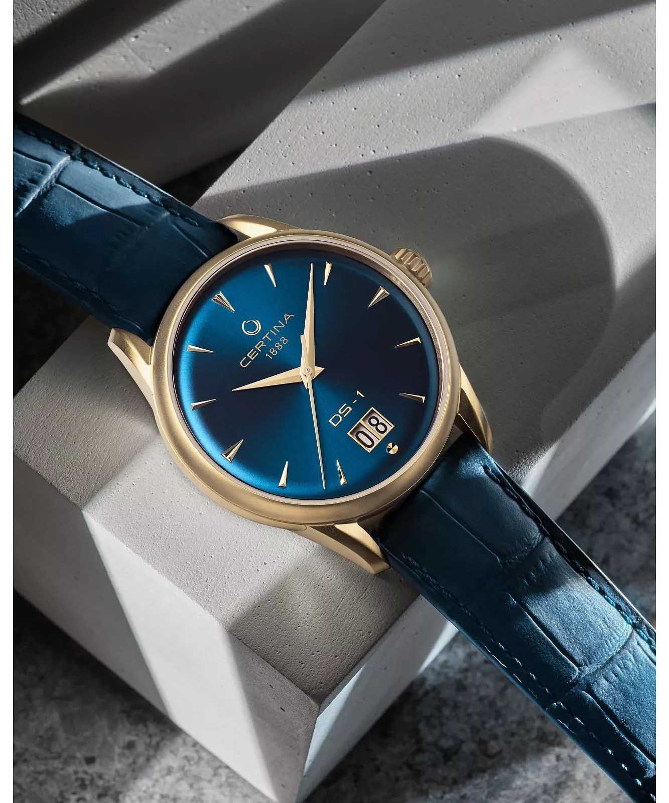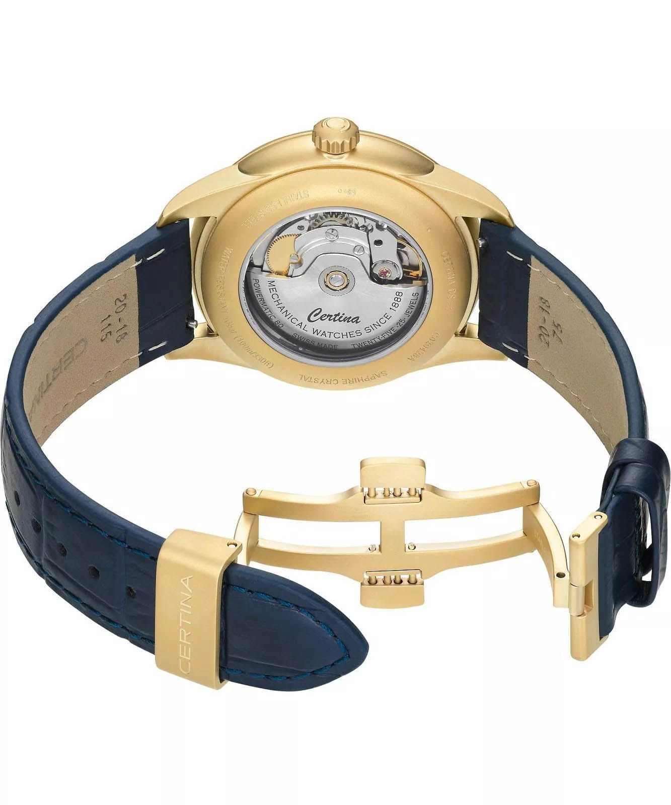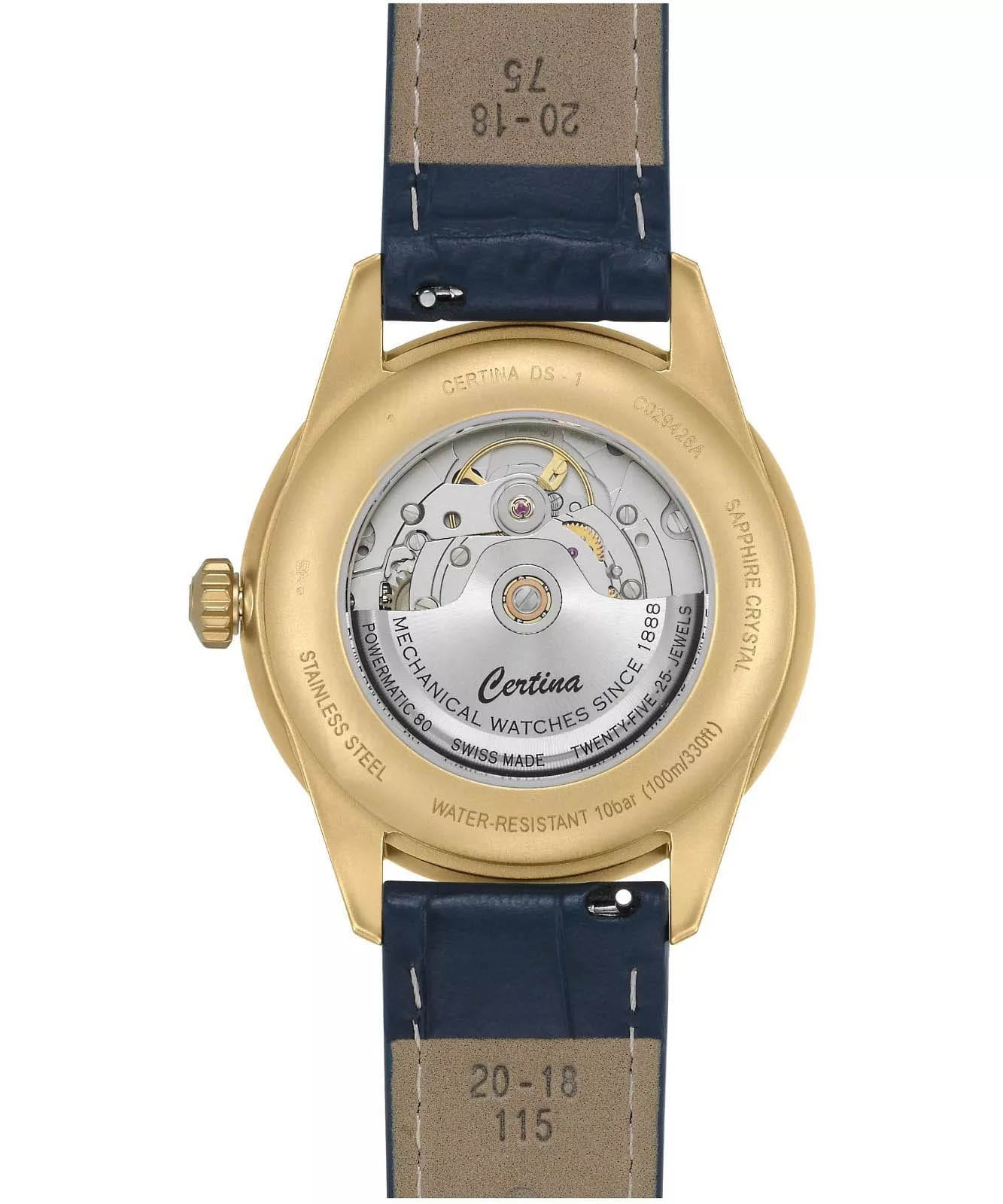 Мужские механические часы Certina C029.426.36.041.00 — это сочетание элегантности, надёжности и швейцарского мастерства. Модель выполнена из нержавеющей стали с PVD-покрытиемPVDУльтратонкое покрытие наносится в технике вакуумного напыления, сочетает в себе нитрид титана особой прочности со слоем золота или оксида хрома. Несёт в себе декоративную или защитную функцию. цвета золота, придающим корпусу благородный внешний вид и устойчивость к царапинам. Диаметр корпуса составляет 41 мм, толщина — 11 мм, что обеспечивает идеальный баланс на запястье. Циферблат синего цвета выполнен в технике sunray, создающей эффект переливающихся лучей, и дополнен золотистыми метками и стрелками. Информация о дате отображается через крупное окошко Big Date, обеспечивающее удобство чтения. Защиту циферблата обеспечивает сапфировое стеклоСапфировое стеклоПрочный и надёжный материал из кристалла сапфира синтетического происхождения, характеризующийся особой твёрдостью и устойчивостью к царапинам и повреждениям. с антибликовым покрытием, устойчивое к повреждениям и обеспечивающее чёткую видимость при любом освещении. Часы оснащены автоматическим механизмом Powermatic 80Powermatic 80Эксклюзивный калибр от швейцарской компании ETA с увеличенным запасом хода до 80 часов за счёт удлинённой заводной пружины. Характеризуется улучшенной системой спуска со сниженным трением., который обеспечивает запас хода до 80 часов. Технология DS (Double Security)Ударопрочный корпусМеханизм заключён в корпус, выполненный из современных материалов, устойчивых к ударам, механическим повреждениям и падению с высоты: инновационный пластик, карбон, нержавеющая сталь, титан. защищает механизм от ударов и вибрации, повышая его долговечность. Водонепроницаемость позволяет использовать часы при плавании и других водных активностях. Ремешок изготовлен из натуральной кожи, обеспечивая комфорт и завершая классический образ модели. Эти часы станут универсальным аксессуаром для тех, кто ценит сочетание стиля, точности и надёжности — идеальный выбор для уверенных в себе мужчин.