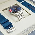 Аксессуар выполнен в классическом стиле, элегантно смотрится сатинированный синий циферблат. Надёжный стальной корпус дополнен уплотнительным кольцом в соответствии с концепцией Двойной Надёжности DSDS ConceptDouble Security Concept, обозначает двойную надёжность и безупречную точность часов Certina. Двойная система защиты подразумевает обеспечение максимальной устойчивости к ударам и высоких показателей водонепроницаемости.. Он защищает швейцарский автоматический механизм ETA Powermatic 80Powermatic 80Эксклюзивный калибр от швейцарской компании ETA с увеличенным запасом хода до 80 часов за счёт удлинённой заводной пружины. Характеризуется улучшенной системой спуска со сниженным трением. с увеличенным запасом хода до 80 часов. Калибр дополнен кремниевой спиралью Nivachron™, устраняющей действие магнитных полей. Выпуклое сапфировое стекло имеет покрытие антиблик. Часы водонепроницаемы до 100 метров. Браслет оснащён системой быстрой замены. В нижней части циферблата размещена крупная апертура даты. Диаметр корпуса: 40 мм.