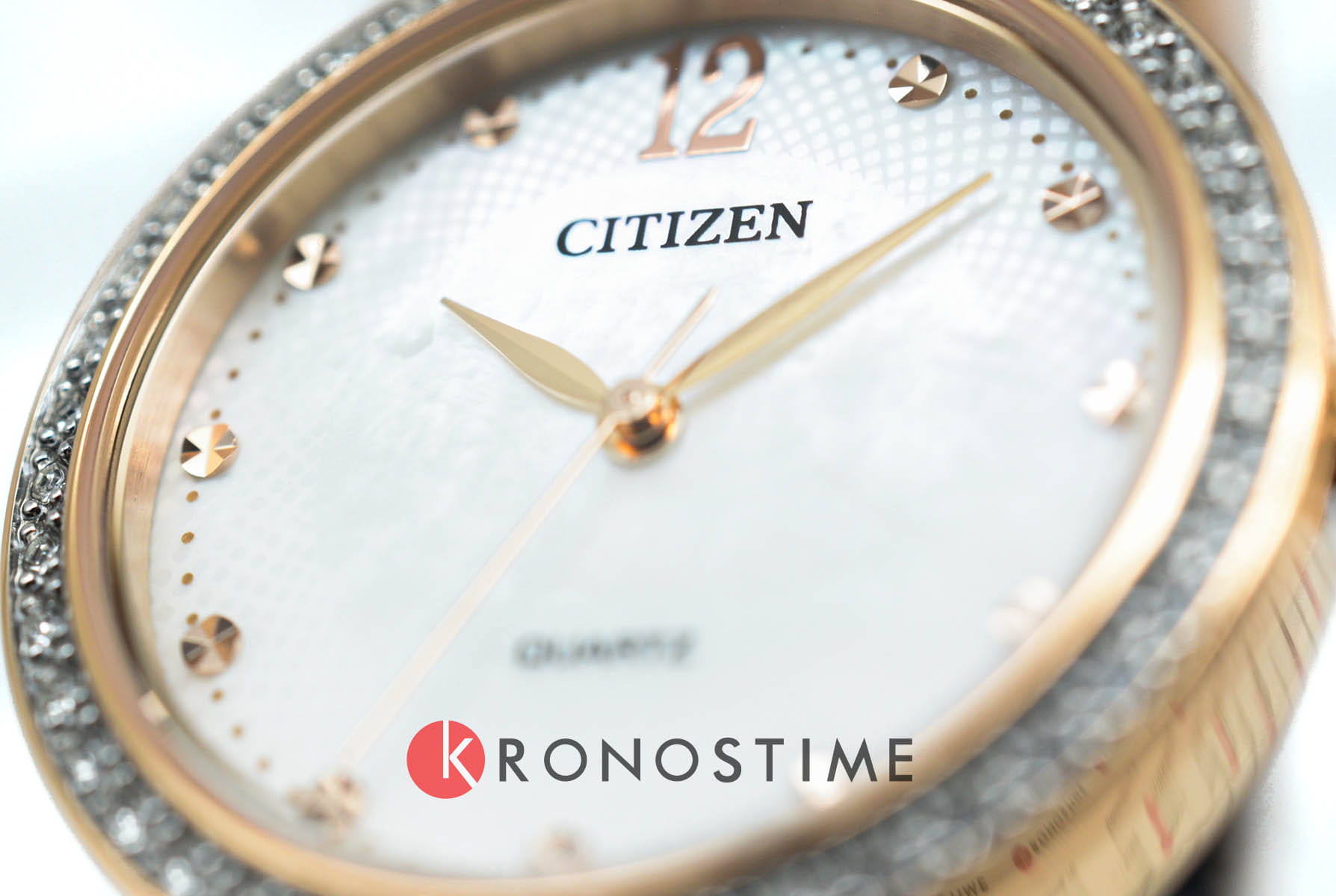 Часы Citizen EL3108-53D представляют собой элегантную модель, выполненную в Японии, сочетающую в себе современные технологии и утончённый дизайн. Корпус и браслет изготовлены из прочной нержавеющей стали с золотистым IP-покрытиемIP-покрытиеМетод ионного напыления. Демонстрирует повышенную устойчивость к истиранию, окислению и химическим веществам. Под воздействием высокого давления и температуры около 1500°C молекулы металла надёжно соединяются с частицами корпуса часов., что обеспечивает долговечность и привлекательный внешний вид. Диаметр корпуса составляет 31 мм, а толщина — всего 7 мм, что делает часы изящными и аккуратными на запястье. Особое внимание привлекает безельБезельВнешний ободок, закрепляющий стекло. В спортивных часах так называется поворотное кольцо с делениями на циферблате, выполняет роль таймера – замеряет отрезки времени на шкале. Неподвижный безель – элемент декора. Однонаправленно вращающийся безель на дайверских часах позволяет фиксировать моменты погружения и выныривания на поверхность., украшенный мерцающими кристаллами, которые придают часам особый шарм и изысканность. Надёжный кварцевый механизм гарантирует точность хода, а водозащита уровня WR 50 позволяет не снимать часы при мытье рук или во время дождя. Перламутровый циферблат украшен часовыми индексами в виде точек и цифр, а также оснащён центральными стрелками часов, минут и секунд для удобного считывания времени и кристаллами. Минеральное стеклоМинеральное стеклоМинеральное стекло представляет собой искусственно выращенный минерал кварца. Такое стекло отличается особой устойчивостью к повреждениям и царапинам. Уступает по некоторым качествам сапфировому стеклу. устойчиво к появлению мелких царапин, сохраняя прозрачность и презентабельный вид. Стальной браслет с золотистым IP-покрытиемIP-покрытиеМетод ионного напыления. Демонстрирует повышенную устойчивость к истиранию, окислению и химическим веществам. Под воздействием высокого давления и температуры около 1500°C молекулы металла надёжно соединяются с частицами корпуса часов. и раскладной застёжкойРаскладная застёжкаТакой тип застёжки используется только на браслетах из металла. Она никогда не раскрывается полностью, происходит разделение на 2 и более частей. Раскладывающая застёжка снизит вероятность потери часов к минимуму. надежно фиксирует часы на запястье, обеспечивая комфорт при ежедневном ношении.