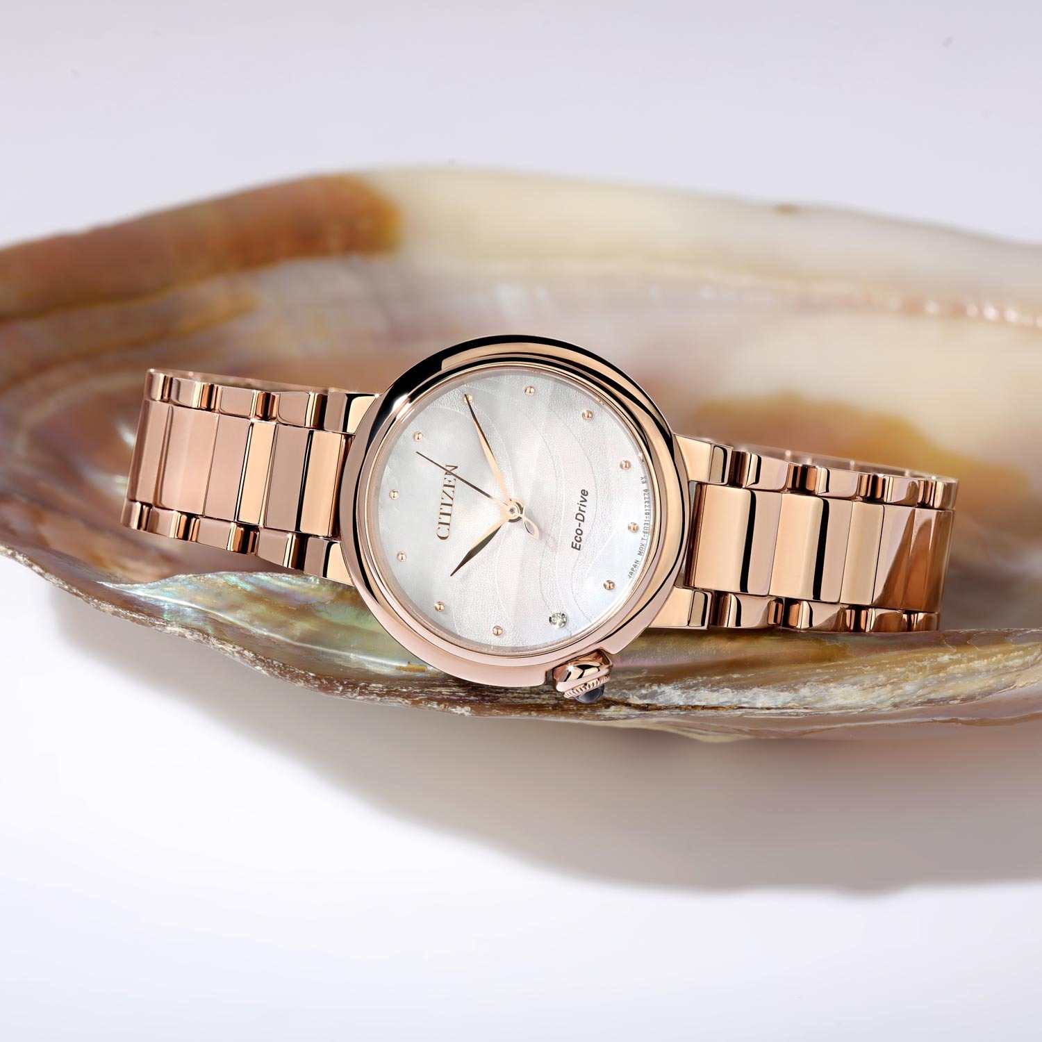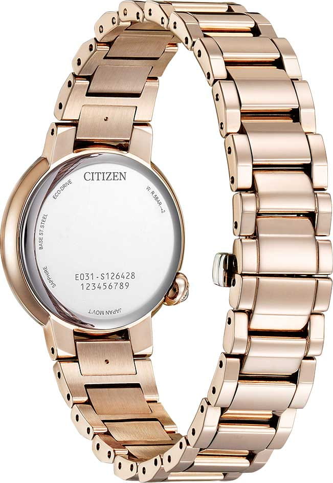Часы Citizen EM0912-84Y — воплощение изысканности и современных технологий, выполненное в Японии. Корпус и литой браслет изготовлены из прочной нержавеющей стали с золотистым IP-покрытиемIP-покрытиеМетод ионного напыления. Демонстрирует повышенную устойчивость к истиранию, окислению и химическим веществам. Под воздействием высокого давления и температуры около 1500°C молекулы металла надёжно соединяются с частицами корпуса часов., что гарантирует долговечность и элегантный внешний вид. Перламутровый розовый циферблат с завораживающими переливами украшен бриллиантом, а часовые метки выполнены в виде точек, что придаёт образу особую утонченность. Заводная головка с защитой находится в положении 8 часов и также украшена камнем. Защиту от царапин обеспечивает сапфировое стеклоСапфировое стеклоПрочный и надёжный материал из кристалла сапфира синтетического происхождения, характеризующийся особой твёрдостью и устойчивостью к царапинам и повреждениям., сохраняющее безупречный вид часов на длительное время. Модель оснащена инновационной системой Eco-Drive, работающей на солнечной энергии и не требующей замены батарейки, с запасом хода до 180 дней. Предусмотрена функция индикации уровня заряда (EOLEOLПредставляет собой систему, уведомляющую владельца часов о необходимости замены элемента питания. За 2 недели до полного разряда батарейки секундная стрелка перестаёт ходить чётко и начинает перепрыгивать на 3-4 деления.) и предотвращения перезарядки. Диаметр корпуса составляет 30 мм, толщина — 8,5 мм, вес — 74 г, что обеспечивает комфортное ношение в течение всего дня. Водозащита уровня 50WR позволяет не снимать часы при мытье рук или в дождливую погоду. Браслет с застежкой «бабочка»Застёжка "бабочка"Такой вид застёжки дополняется предохранителями, помогающими избежать случайного раскрытия браслета. Обладают изящным исполнением. обеспечивает дополнительный комфорт и безопасность при носке. Эта модель станет не только стильным аксессуаром, но и символом безупречного вкуса и внимания к деталям.