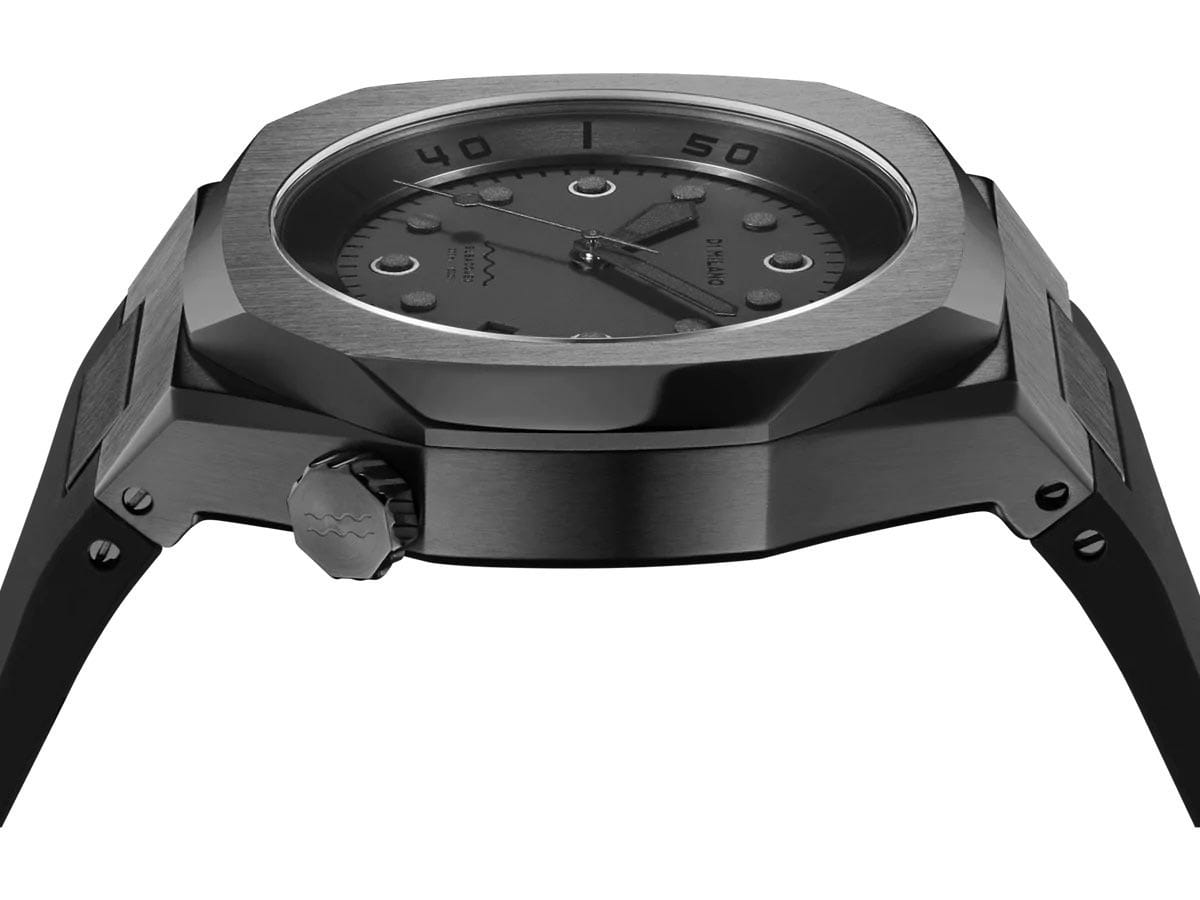 Часы D1 Milano DVRJSH — это механические мужские часы с автоподзаводом, которые поражают своим спортивным стилем и точностью исполнения. С этими удобными часами покорение морских глубин выйдет на новый уровень. Корпус с безелемБезельВнешний ободок, закрепляющий стекло. В спортивных часах так называется поворотное кольцо с делениями на циферблате, выполняет роль таймера – замеряет отрезки времени на шкале. Неподвижный безель – элемент декора. Однонаправленно вращающийся безель на дайверских часах позволяет фиксировать моменты погружения и выныривания на поверхность. из нержавеющей стали с PVDPVDУльтратонкое покрытие наносится в технике вакуумного напыления, сочетает в себе нитрид титана особой прочности со слоем золота или оксида хрома. Несёт в себе декоративную или защитную функцию. покрытием гармонично сочетается с таким же черным циферблатом. Запас хода 41 час. Циферблат защищен сапфировым стекломСапфировое стеклоПрочный и надёжный материал из кристалла сапфира синтетического происхождения, характеризующийся особой твёрдостью и устойчивостью к царапинам и повреждениям., а черный силиконовый ремешок придает ему элегантный вид. На циферблате часов есть окошко даты в положении 4 часа. Водонепроницаемость часов достигает 300 метров, что делает их подходящими для для дайвинга.