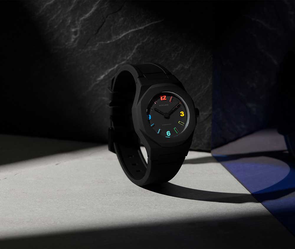 Часы D1 Milano Nanochrome Nano Rainbow NCRJ03 – оригинальные часы для стильных женщин. Корпус выполнен из резины с покрытием Софт-Тач. Циферблат с разноцветными арабскими цифрами покрыт минеральным стекломМинеральное стеклоМинеральное стекло представляет собой искусственно выращенный минерал кварца. Такое стекло отличается особой устойчивостью к повреждениям и царапинам. Уступает по некоторым качествам сапфировому стеклу.. Задняя крышка часов – стальная, на 4-х винтах. Ремешок силиконовый с классической застежкой.
