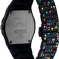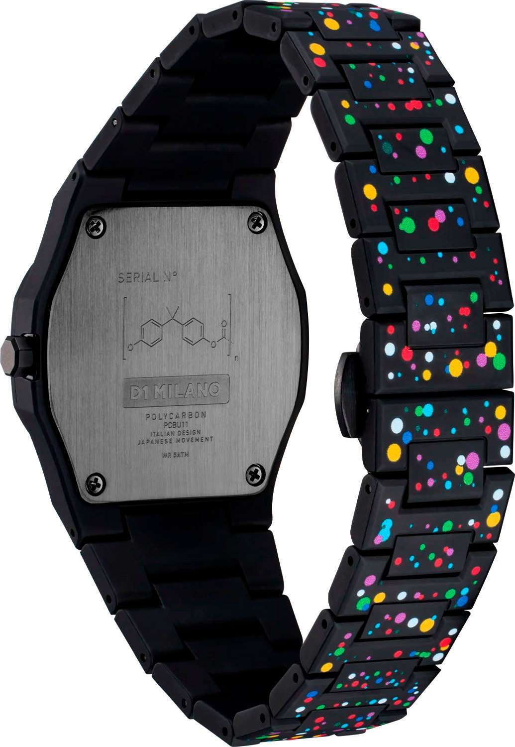 Часы D1 Milano Polycarbon PCBU11 – молодежные часы в стиле унисекс для повседневных образов, стильные и комфортные.  Модель Poly Dot имеет черные с цветными брызгами корпус и браслет  из поликарбоната с покрытием Софт-Тач. Циферблат лаконичный, защищен минеральным стекломМинеральное стеклоМинеральное стекло представляет собой искусственно выращенный минерал кварца. Такое стекло отличается особой устойчивостью к повреждениям и царапинам. Уступает по некоторым качествам сапфировому стеклу. с антибликовым покрытием. Стальная задняя крышка на 4 винтах.  Пластиковый браслет на застёжке-бабочке с кнопкамиЗастёжка "бабочка"Такой вид застёжки дополняется предохранителями, помогающими избежать случайного раскрытия браслета. Обладают изящным исполнением. .