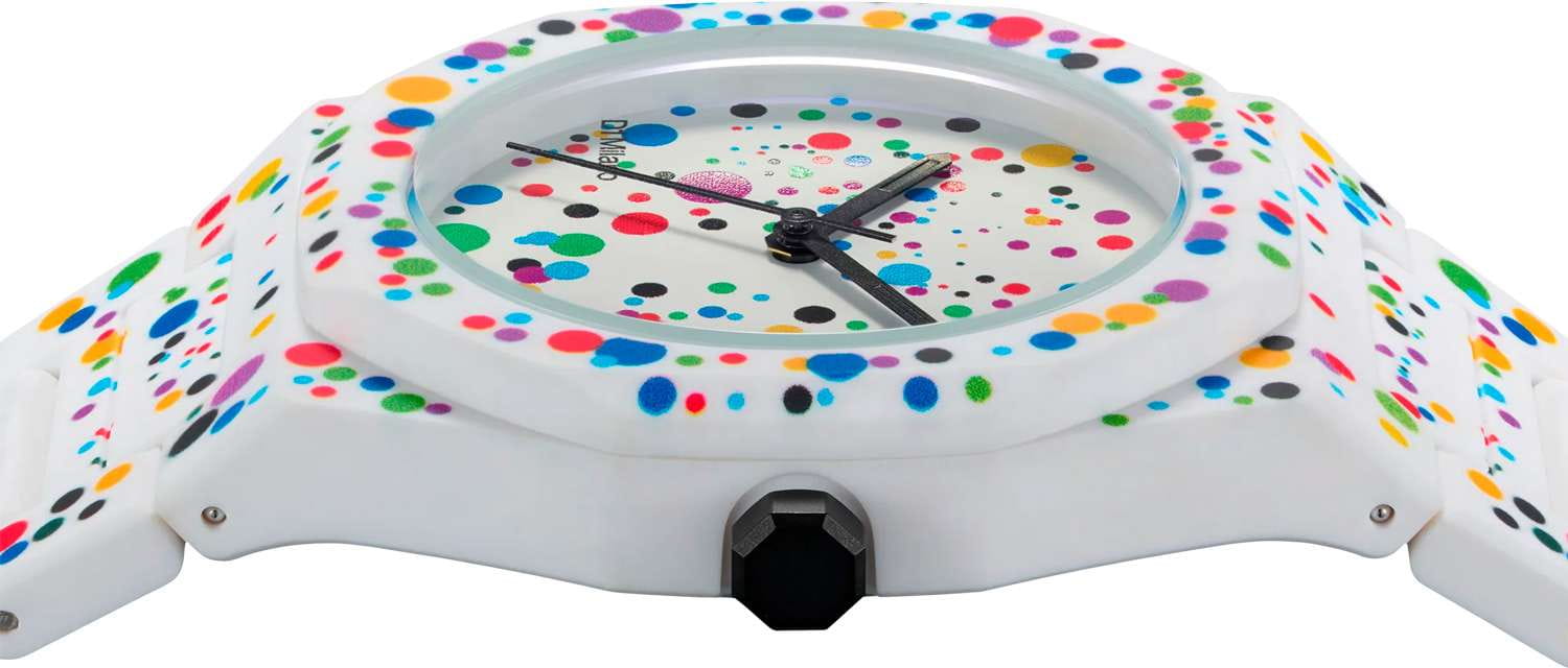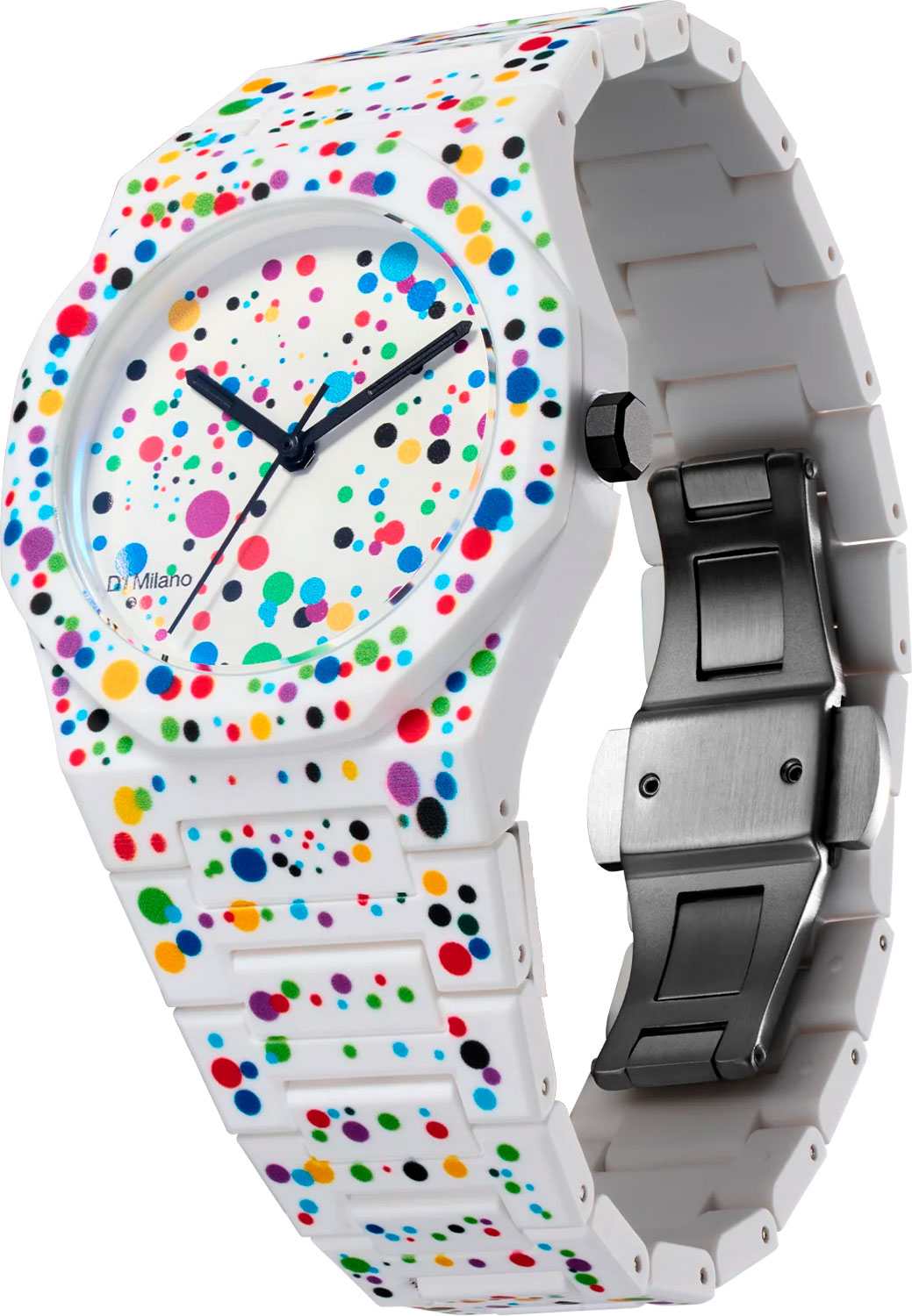 Часы D1 Milano Polycarbon PCBU12 – молодежные часы в стиле унисекс для повседневных образов, стильные и комфортные. Модель Poly Dot имеет белые с цветными брызгами корпус и браслет из поликарбоната с покрытием Софт-Тач. Циферблат лаконичный, защищен минеральным стекломМинеральное стеклоМинеральное стекло представляет собой искусственно выращенный минерал кварца. Такое стекло отличается особой устойчивостью к повреждениям и царапинам. Уступает по некоторым качествам сапфировому стеклу. с антибликовым покрытием. Стальная задняя крышка на 4 винтах. Пластиковый браслет на застёжке-бабочке с кнопкамиЗастёжка "бабочка"Такой вид застёжки дополняется предохранителями, помогающими избежать случайного раскрытия браслета. Обладают изящным исполнением. .
