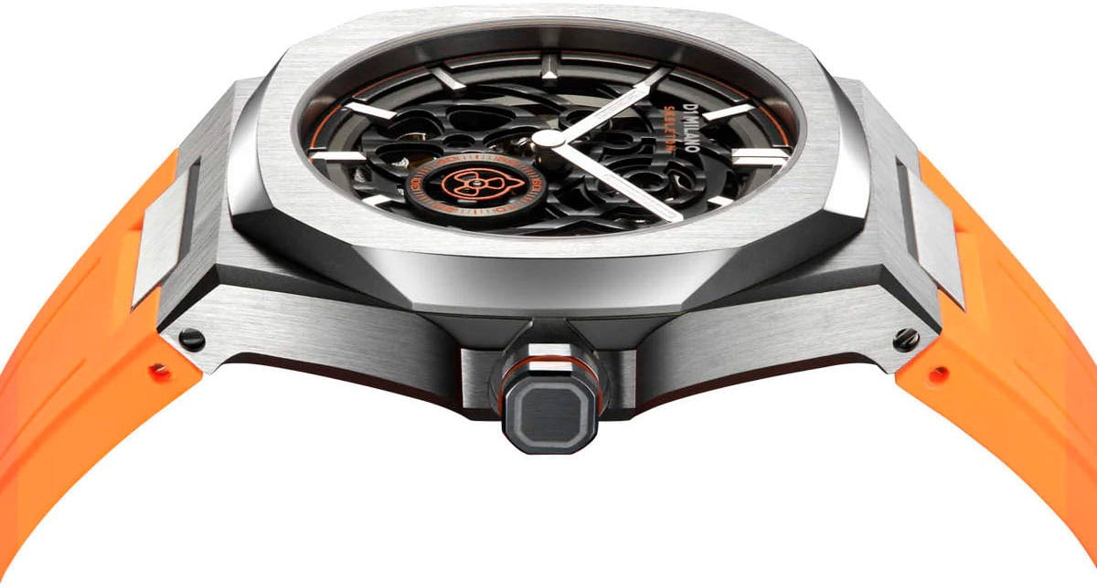 Часы D1 Milano SKRJ16 — это эффектные механические мужские часы, разработанные для ценителей уникальных аксессуаров. Их утонченный дизайн и высокое качество исполнения делают эти часы незаменимым элементом вашего стиля. Изготовленные в Италии, они оснащены надежным механизмом Miyota 8N40 с автоподзаводом, обеспечивающими запас хода до 41 часа. Частота работы механизма составляет 21600 полуколебаний в час. Часы имеют корпус из нержавеющей стали 316L, что гарантирует долговечность и стойкость к внешним воздействиям. Серый скелетонизированный циферблат защищен сапфировым стекломСапфировое стеклоПрочный и надёжный материал из кристалла сапфира синтетического происхождения, характеризующийся особой твёрдостью и устойчивостью к царапинам и повреждениям. с антибликовым покрытием, подчеркивающим элегантность и изысканность модели. Метки в виде штрихов и прозрачная задняя крышка, закрепленная на 8 винтах, придают часам особый шарм. Резиновый ремешок оранжевого цвета со стандартной застежкой обеспечивает комфортное и надежное ношение. Водозащита до 50 метров делает эти часы подходящими для повседневного использования.