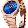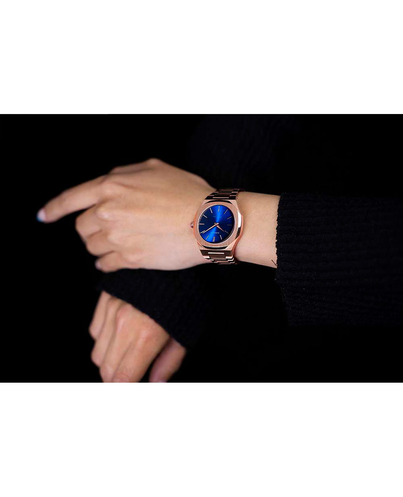 Женские наручные часы D1 Milano UTBL12 из коллекции Ultra Thin сочетают в себе элегантный дизайн и современные технологии. Модель обладает круглым корпусом диаметром 34 мм, изготовленным из высококачественной нержавеющей стали 316L с PVD-покрытиемPVDУльтратонкое покрытие наносится в технике вакуумного напыления, сочетает в себе нитрид титана особой прочности со слоем золота или оксида хрома. Несёт в себе декоративную или защитную функцию.. Толщина ультратонкого корпуса составляет всего 6 мм, делая аксессуар легким и удобным для повседневного использования. Браслет также выполнен из нержавеющей стали с PVD-покрытиемPVDУльтратонкое покрытие наносится в технике вакуумного напыления, сочетает в себе нитрид титана особой прочности со слоем золота или оксида хрома. Несёт в себе декоративную или защитную функцию. и с раскладной застежкойРаскладной замокДанный вариант застежки используется только на часах с металлическим браслетом. Отличительная особенность такого крепления в том, что длина браслета становится универсальной и вы можете самостоятельно отрегулировать нужный вам размер – застежка просто двигается по браслету часов., гарантирующей комфортное ношение и безопасность. Синий циферблат с эффектом Sunray украшен метками в виде штрихов и оснащен стрелочным механизмом, который подчеркивает элегантность модели. Для защиты используется сапфировое стеклоСапфировое стеклоПрочный и надёжный материал из кристалла сапфира синтетического происхождения, характеризующийся особой твёрдостью и устойчивостью к царапинам и повреждениям. с антибликовым покрытиемАнтибликовое покрытиеСлой оксида металла в 0,13-0,3 микрон, благодаря которому стекло часов не бликует и не отражает свет. Антибликовое покрытие уменьшает отражение света в 10 раз, обеспечивая отличную читаемость показателей циферблата., обеспечивающее прочную защиту от царапин и бликов. Часы работают на кварцевом механизме Miyota, гарантирующем точность хода без необходимости регулярного подзавода. Водонепроницаемость часов достигает 5 атмосфер (50 метров), что позволяет использовать их во время мытья рук или плавания, однако не рекомендуется для глубоководного дайвинга.