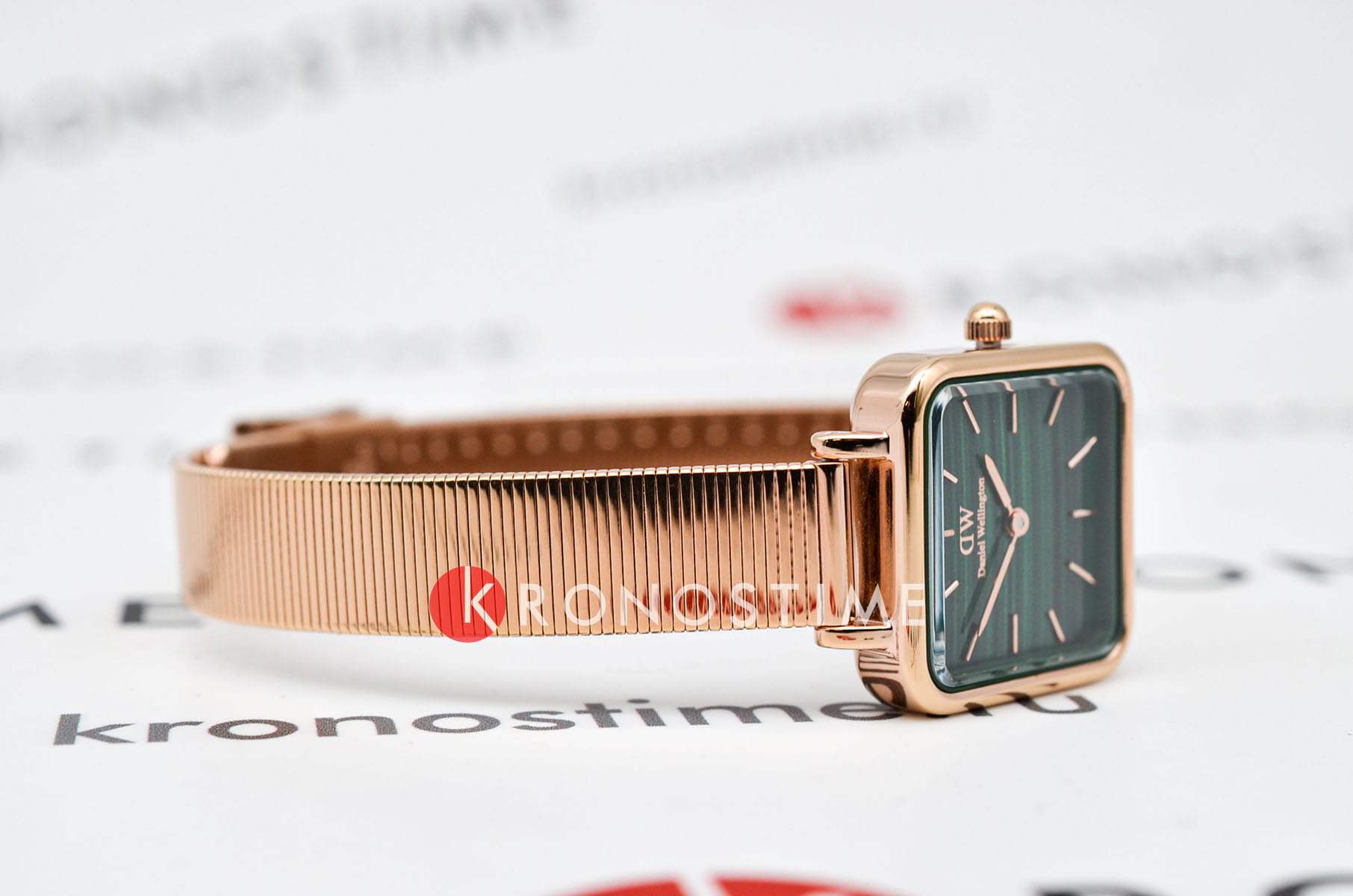 Женские кварцевые часы Daniel Wellington DW00100520 из коллекции Quadro Studio — шведская минималистичная элегантность в квадратном корпусе. Корпус из стали 316L с PVD-покрытиемPVDУльтратонкое покрытие наносится в технике вакуумного напыления, сочетает в себе нитрид титана особой прочности со слоем золота или оксида хрома. Несёт в себе декоративную или защитную функцию. цвета розового золота, размером 22 × 22 мм. Циферблат — зелёный с штриховыми метками. Стекло — минеральноеМинеральное стеклоМинеральное стекло представляет собой искусственно выращенный минерал кварца. Такое стекло отличается особой устойчивостью к повреждениям и царапинам. Уступает по некоторым качествам сапфировому стеклу.. Браслет — стальной с PVD-покрытиемPVDУльтратонкое покрытие наносится в технике вакуумного напыления, сочетает в себе нитрид титана особой прочности со слоем золота или оксида хрома. Несёт в себе декоративную или защитную функцию. на раскладной застёжкеРаскладная застёжкаТакой тип застёжки используется только на браслетах из металла. Она никогда не раскрывается полностью, происходит разделение на 2 и более частей. Раскладывающая застёжка снизит вероятность потери часов к минимуму.. Водонепроницаемость 30 м. Идеальный выбор для тех, кто ценит скандинавский дизайн и утончённую простоту.