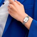 Женские наручные часы с минеральным стекломМинеральное стеклоМинеральное стекло представляет собой искусственно выращенный минерал кварца. Такое стекло отличается особой устойчивостью к повреждениям и царапинам. Уступает по некоторым качествам сапфировому стеклу. Daniel Wellington Quadro Lumine Pressed Sterling DW00100597, кварцевый механизм с высокой точностью. Корпус часов изготовлен из нержавеющей стали 316L с PVD-покрытиемPVDУльтратонкое покрытие наносится в технике вакуумного напыления, сочетает в себе нитрид титана особой прочности со слоем золота или оксида хрома. Несёт в себе декоративную или защитную функцию.. Накладные метки в виде штрихов. Японский кварцевый механизм. Рифленая заводная головка. Класс водозащиты: 30 метров, позволит защитить корпус от случайных брызг или капель дождя. Стальной браслет миланского плетения на раскладном замкеРаскладной замокДанный вариант застежки используется только на часах с металлическим браслетом. Отличительная особенность такого крепления в том, что длина браслета становится универсальной и вы можете самостоятельно отрегулировать нужный вам размер – застежка просто двигается по браслету часов..