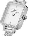 Женские наручные часы с минеральным стекломМинеральное стеклоМинеральное стекло представляет собой искусственно выращенный минерал кварца. Такое стекло отличается особой устойчивостью к повреждениям и царапинам. Уступает по некоторым качествам сапфировому стеклу. Daniel Wellington Quadro Mini Lumine Bezel Silver DW00100732, кварцевый механизм с высокой точностью. Корпус часов изготовлен из нержавеющей стали. Накладные метки в виде штрихов. Японский кварцевый механизм. Рифленая заводная головка. Класс водозащиты: 30 метров, позволит защитить корпус от случайных брызг или капель дождя. Стальной браслет миланского плетения на раскладном замкеРаскладной замокДанный вариант застежки используется только на часах с металлическим браслетом. Отличительная особенность такого крепления в том, что длина браслета становится универсальной и вы можете самостоятельно отрегулировать нужный вам размер – застежка просто двигается по браслету часов.. БезельБезельВнешний ободок, закрепляющий стекло. В спортивных часах так называется поворотное кольцо с делениями на циферблате, выполняет роль таймера – замеряет отрезки времени на шкале. Неподвижный безель – элемент декора. Однонаправленно вращающийся безель на дайверских часах позволяет фиксировать моменты погружения и выныривания на поверхность. инкрустирован кристаллами.