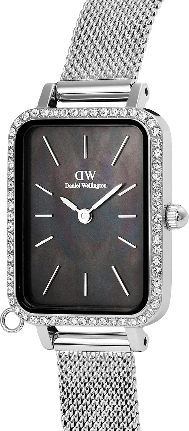Женские наручные часы с минеральным стекломМинеральное стеклоМинеральное стекло представляет собой искусственно выращенный минерал кварца. Такое стекло отличается особой устойчивостью к повреждениям и царапинам. Уступает по некоторым качествам сапфировому стеклу. Daniel Wellington Quadro Crystal Zodiac Sterling DW00100747, кварцевый механизм с высокой точностью. Корпус часов изготовлен из нержавеющей стали. БезельБезельВнешний ободок, закрепляющий стекло. В спортивных часах так называется поворотное кольцо с делениями на циферблате, выполняет роль таймера – замеряет отрезки времени на шкале. Неподвижный безель – элемент декора. Однонаправленно вращающийся безель на дайверских часах позволяет фиксировать моменты погружения и выныривания на поверхность. украшен кристаллами Swarovski. Матовый циферблат украшен фирменным логотипом Daniel Wellington. Накладные метки в виде штрихов. Японский кварцевый механизм. Рифленая заводная головка. Класс водозащиты: 30 метров, позволит защитить корпус от случайных брызг или капель дождя. Стальной браслет миланского плетения на раскладном замкеРаскладной замокДанный вариант застежки используется только на часах с металлическим браслетом. Отличительная особенность такого крепления в том, что длина браслета становится универсальной и вы можете самостоятельно отрегулировать нужный вам размер – застежка просто двигается по браслету часов.. Корпус дополнен колечком для подвески.