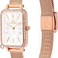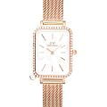 Женские наручные часы с минеральным стекломМинеральное стеклоМинеральное стекло представляет собой искусственно выращенный минерал кварца. Такое стекло отличается особой устойчивостью к повреждениям и царапинам. Уступает по некоторым качествам сапфировому стеклу. Daniel Wellington Quadro Crystal Zodiac Melrose DW00100748, кварцевый механизм с высокой точностью. Корпус часов изготовлен из нержавеющей стали с PVD-покрытиемPVDУльтратонкое покрытие наносится в технике вакуумного напыления, сочетает в себе нитрид титана особой прочности со слоем золота или оксида хрома. Несёт в себе декоративную или защитную функцию.. БезельБезельВнешний ободок, закрепляющий стекло. В спортивных часах так называется поворотное кольцо с делениями на циферблате, выполняет роль таймера – замеряет отрезки времени на шкале. Неподвижный безель – элемент декора. Однонаправленно вращающийся безель на дайверских часах позволяет фиксировать моменты погружения и выныривания на поверхность. украшен кристаллами Swarovski. Матовый циферблат украшен фирменным логотипом Daniel Wellington. Накладные метки в виде штрихов. Японский кварцевый механизм. Рифленая заводная головка. Класс водозащиты: 30 метров, позволит защитить корпус от случайных брызг или капель дождя. Стальной браслет миланского плетения с PVD-покрытиемPVDУльтратонкое покрытие наносится в технике вакуумного напыления, сочетает в себе нитрид титана особой прочности со слоем золота или оксида хрома. Несёт в себе декоративную или защитную функцию. на раскладном замкеРаскладной замокДанный вариант застежки используется только на часах с металлическим браслетом. Отличительная особенность такого крепления в том, что длина браслета становится универсальной и вы можете самостоятельно отрегулировать нужный вам размер – застежка просто двигается по браслету часов.. Корпус дополнен колечком для подвески.