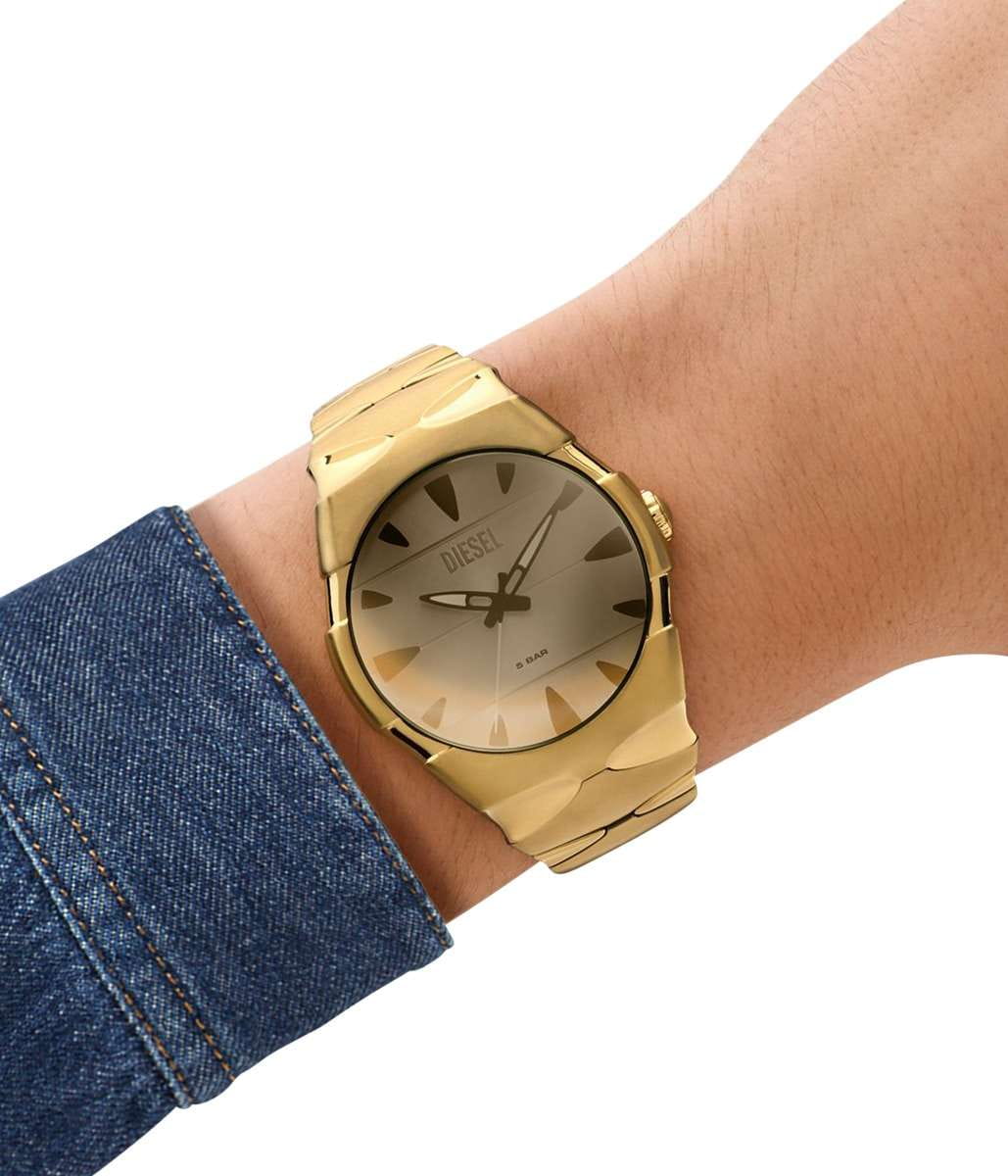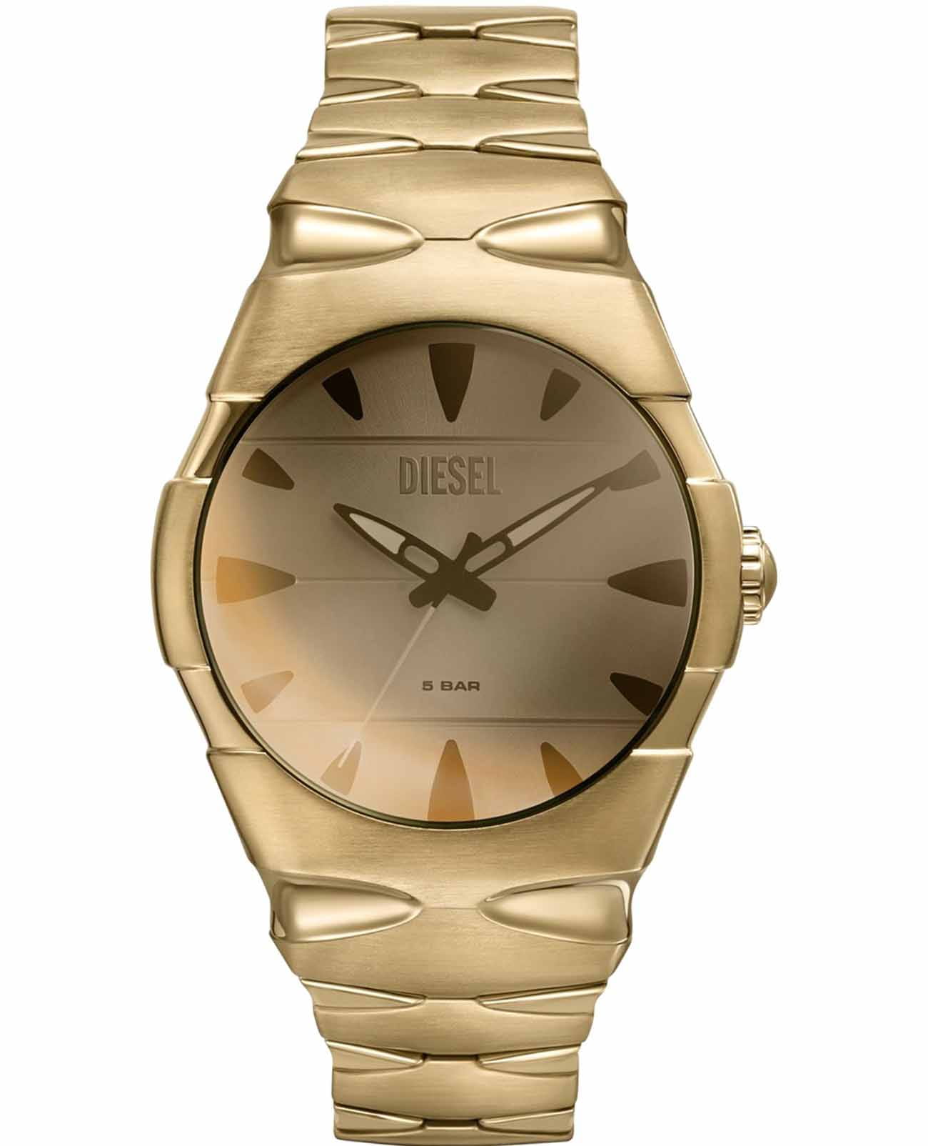 Откройте для себя элегантность и стиль с наручными часами Diesel D-Sruptor DZ2214, которые станут идеальным дополнением к вашему образу. Эти часы не только подчеркнут вашу индивидуальность, но и обеспечат надежность и функциональность, которые вы ожидаете от бренда Diesel. Часы оснащены кварцевым механизмом и аналоговым способом отображения времени, что обеспечивает точность и простоту использования. 12-часовой формат с часовыми, минутными и секундными стрелками, а также рисками вместо цифр придает циферблату современный и лаконичный вид. Корпус и браслет выполнены из нержавеющей стали с жёлто-золотым PVDPVDУльтратонкое покрытие наносится в технике вакуумного напыления, сочетает в себе нитрид титана особой прочности со слоем золота или оксида хрома. Несёт в себе декоративную или защитную функцию. покрытием, что добавляет часовому аксессуару изысканности и шарма. Фиксированный безельБезельВнешний ободок, закрепляющий стекло. В спортивных часах так называется поворотное кольцо с делениями на циферблате, выполняет роль таймера – замеряет отрезки времени на шкале. Неподвижный безель – элемент декора. Однонаправленно вращающийся безель на дайверских часах позволяет фиксировать моменты погружения и выныривания на поверхность. также изготовлен из нержавеющей стали с золотистым PVDPVDУльтратонкое покрытие наносится в технике вакуумного напыления, сочетает в себе нитрид титана особой прочности со слоем золота или оксида хрома. Несёт в себе декоративную или защитную функцию. покрытием, гармонично дополняя общий дизайн. Стрелки с люминесцентным покрытиемЛюминесцентное покрытиеПозволяет считывать показания времени в темноте. Производители наносят на стрелки, часовые индексы, безель или поверхность циферблата светонакопительный состав, дающий холодное свечение. обеспечивают удобное считывание времени в темноте после кратковременного пребывания на свету, что делает эти часы практичными в любых условиях. А устойчивое к царапинам минеральное стеклоМинеральное стеклоМинеральное стекло представляет собой искусственно выращенный минерал кварца. Такое стекло отличается особой устойчивостью к повреждениям и царапинам. Уступает по некоторым качествам сапфировому стеклу. надежно защищает циферблат. Ширина браслета составляет 14 мм, а раскладная застёжкаРаскладная застёжкаТакой тип застёжки используется только на браслетах из металла. Она никогда не раскрывается полностью, происходит разделение на 2 и более частей. Раскладывающая застёжка снизит вероятность потери часов к минимуму. обеспечивает удобную посадку и надежную фиксацию. Класс водозащиты 5 бар (50 метров) позволяет не беспокоиться о попадании воды в корпус при мытье рук или прогулке под дождем.