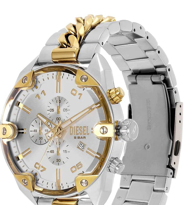 Мужские наручные часы-хронографХронографФункция позволяет измерять отрезки времени с особой точностью: часы, минуты, секунды. Верным признаком хронографа является наличие на циферблате 3 дополнительных окошек-счётчиков. с секундомеромСекундомерСекундоме́р — прибор, способный измерять интервалы времени с точностью до долей секунды. Diesel Spiked DZ4629, кварцевый механизм с высокой точностью. Минеральное стеклоМинеральное стеклоМинеральное стекло представляет собой искусственно выращенный минерал кварца. Такое стекло отличается особой устойчивостью к повреждениям и царапинам. Уступает по некоторым качествам сапфировому стеклу. устойчивое к мелким механическим повреждениям. Класс водозащиты: 50 метров, позволит защитить корпус от случайных брызг или капель дождя. Корпус часов изготовлен из стали с IP-покрытиемIP-покрытиеМетод ионного напыления. Демонстрирует повышенную устойчивость к истиранию, окислению и химическим веществам. Под воздействием высокого давления и температуры около 1500°C молекулы металла надёжно соединяются с частицами корпуса часов.. Циферблат выполнен по технологии Sunray (солнечные лучи). Метки в виде штрихов и арабских цифр. Окошко даты находится в положении 4 часа. Стрелки и метки с люминесцентным покрытиемЛюминесцентное покрытиеПозволяет считывать показания времени в темноте. Производители наносят на стрелки, часовые индексы, безель или поверхность циферблата светонакопительный состав, дающий холодное свечение.. Надежный стальной браслет с декоративными вставками в виде звеньев цепи с IP-покрытиемIP-покрытиеМетод ионного напыления. Демонстрирует повышенную устойчивость к истиранию, окислению и химическим веществам. Под воздействием высокого давления и температуры около 1500°C молекулы металла надёжно соединяются с частицами корпуса часов. на раскладной застёжкеРаскладная застёжкаТакой тип застёжки используется только на браслетах из металла. Она никогда не раскрывается полностью, происходит разделение на 2 и более частей. Раскладывающая застёжка снизит вероятность потери часов к минимуму..