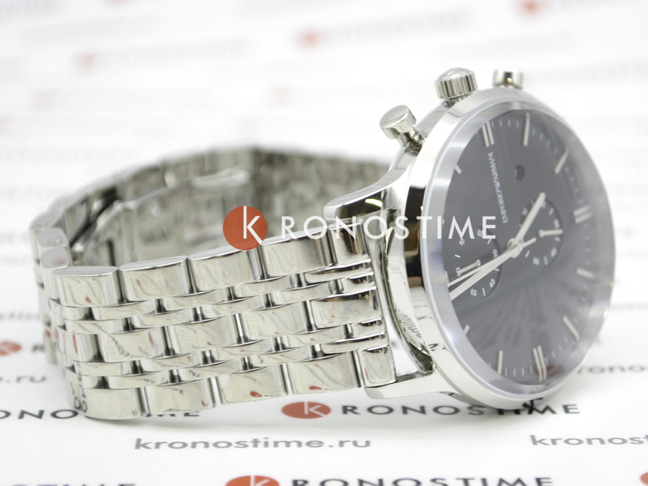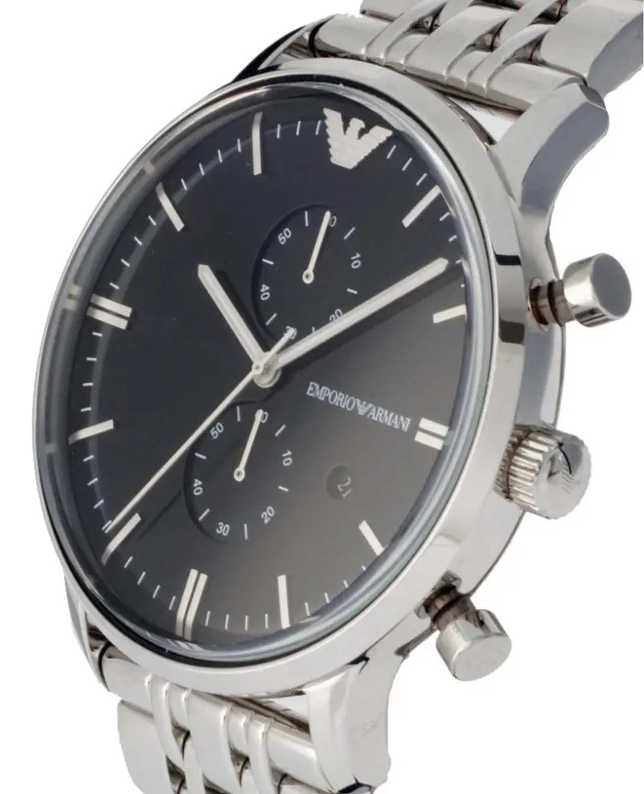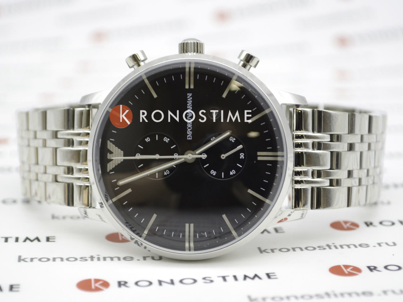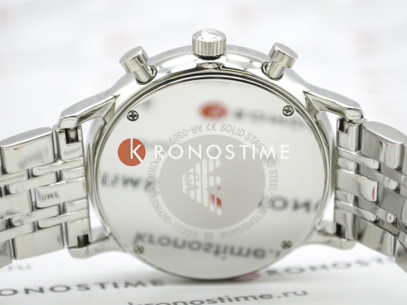 Мужские наручные часы-хронографХронографФункция позволяет измерять отрезки времени с особой точностью: часы, минуты, секунды. Верным признаком хронографа является наличие на циферблате 3 дополнительных окошек-счётчиков. с секундомеромСекундомерСекундоме́р — прибор, способный измерять интервалы времени с точностью до долей секунды. и минеральным стекломМинеральное стеклоМинеральное стекло представляет собой искусственно выращенный минерал кварца. Такое стекло отличается особой устойчивостью к повреждениям и царапинам. Уступает по некоторым качествам сапфировому стеклу. Emporio Armani Classics AR0389, кварцевый механизм с высокой точностью. Корпус часов изготовлен из стали. Окошко даты находится в положении 4 часа. Стрелки и метки с люминесцентным покрытиемЛюминесцентное покрытиеПозволяет считывать показания времени в темноте. Производители наносят на стрелки, часовые индексы, безель или поверхность циферблата светонакопительный состав, дающий холодное свечение.. Класс водозащиты: 50 метров, позволит защитить корпус от случайных брызг или капель дождя. Стальной браслет на застёжке-бабочке с кнопкамиЗастёжка "бабочка"Такой вид застёжки дополняется предохранителями, помогающими избежать случайного раскрытия браслета. Обладают изящным исполнением. .